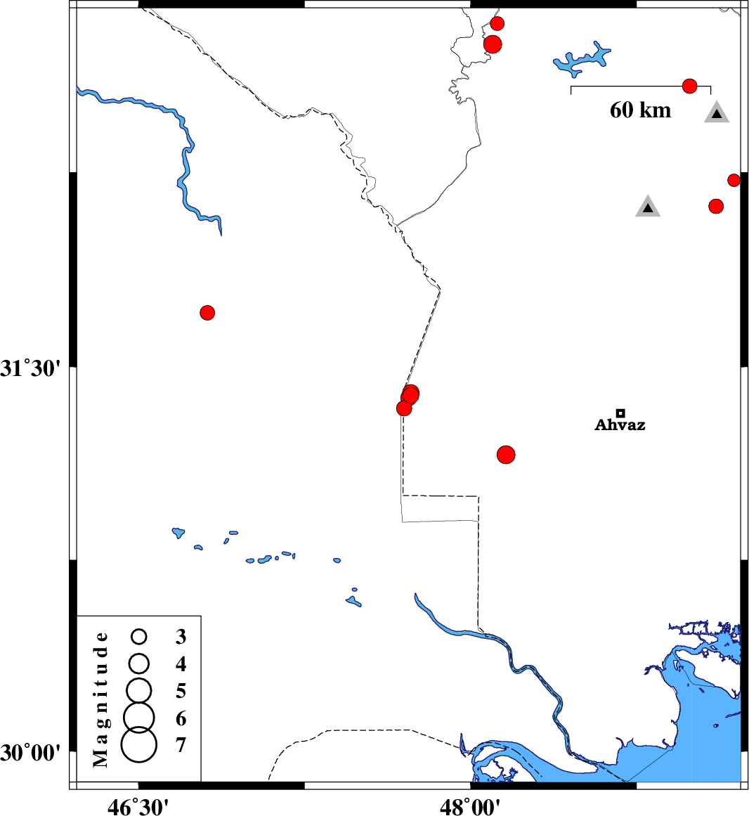 | 2007/08/31 | 02:19:55.4 | 05:49:55.4 | 31.4 | 47.73 | 14 | ML3.3 | 46 km South-West of Susangerd, Khoozestan Province | ||