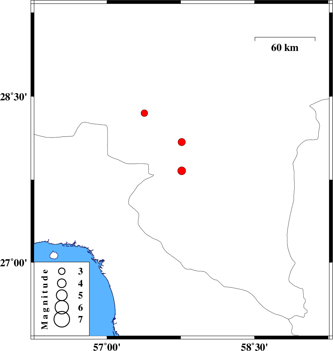 | 2007/07/25 | 19:46:00.3 | 23:16:00.3 | 28.35 | 57.38 | 14 | ML3.1 | 49 km South-West of Jiroft, Kerman Province |