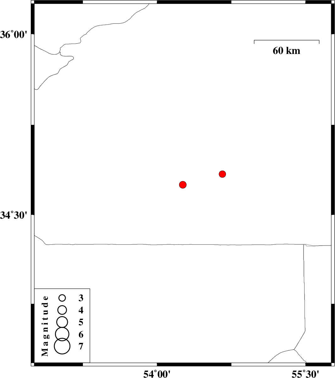 | 2007/08/30 | 22:04:09.2 | 01:34:09.2 | 34.84 | 54.66 | 18 | ML3.1 | 139 km South-East of Semnan, Semnan Province |