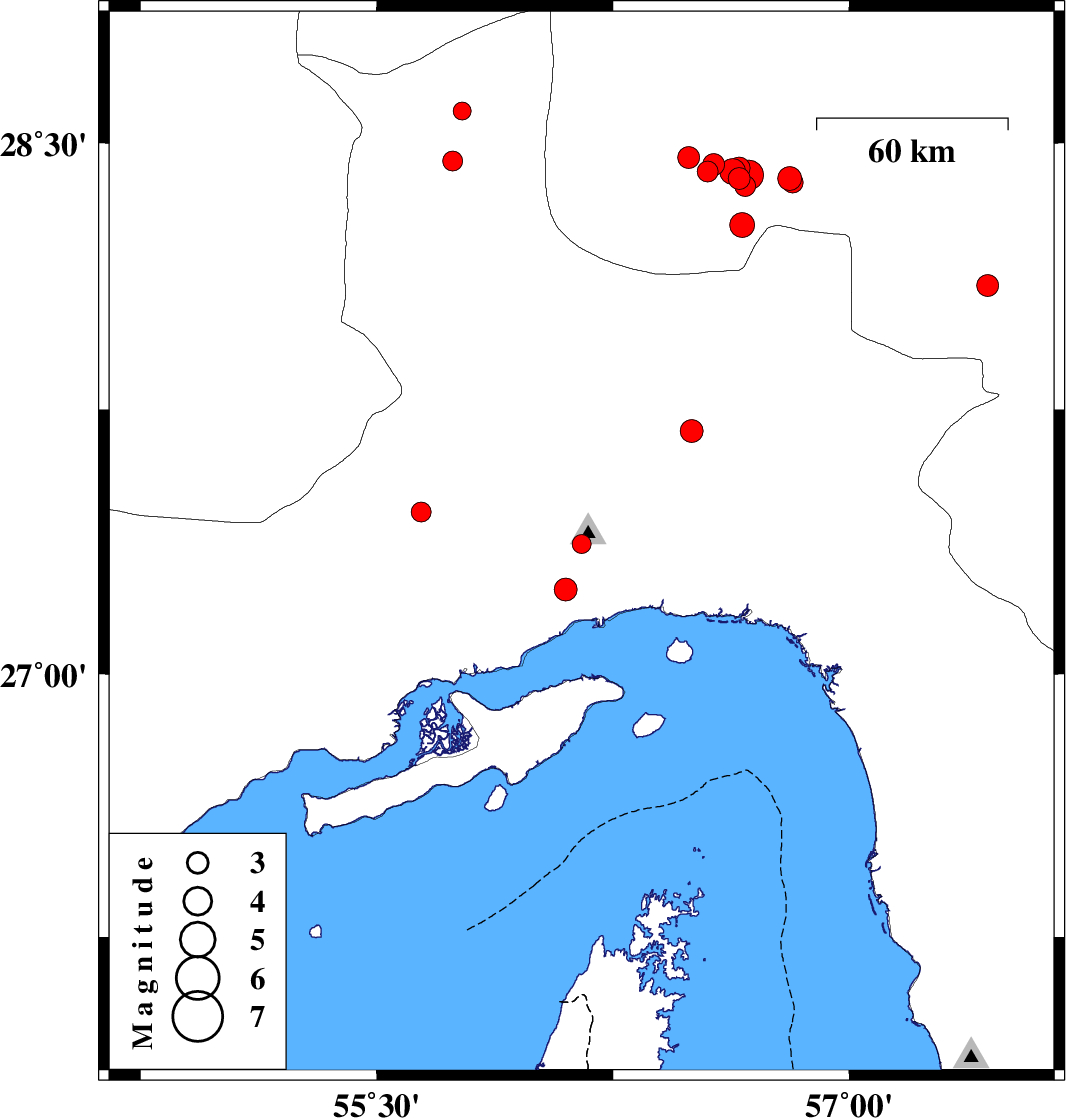 | 2007/10/03 | 05:06:15.3 | 08:36:15.3 | 27.37 | 56.15 | 14 | ML2.7 | 23 km North-West of Bandar-e abbas, Hormozgan Province | ||