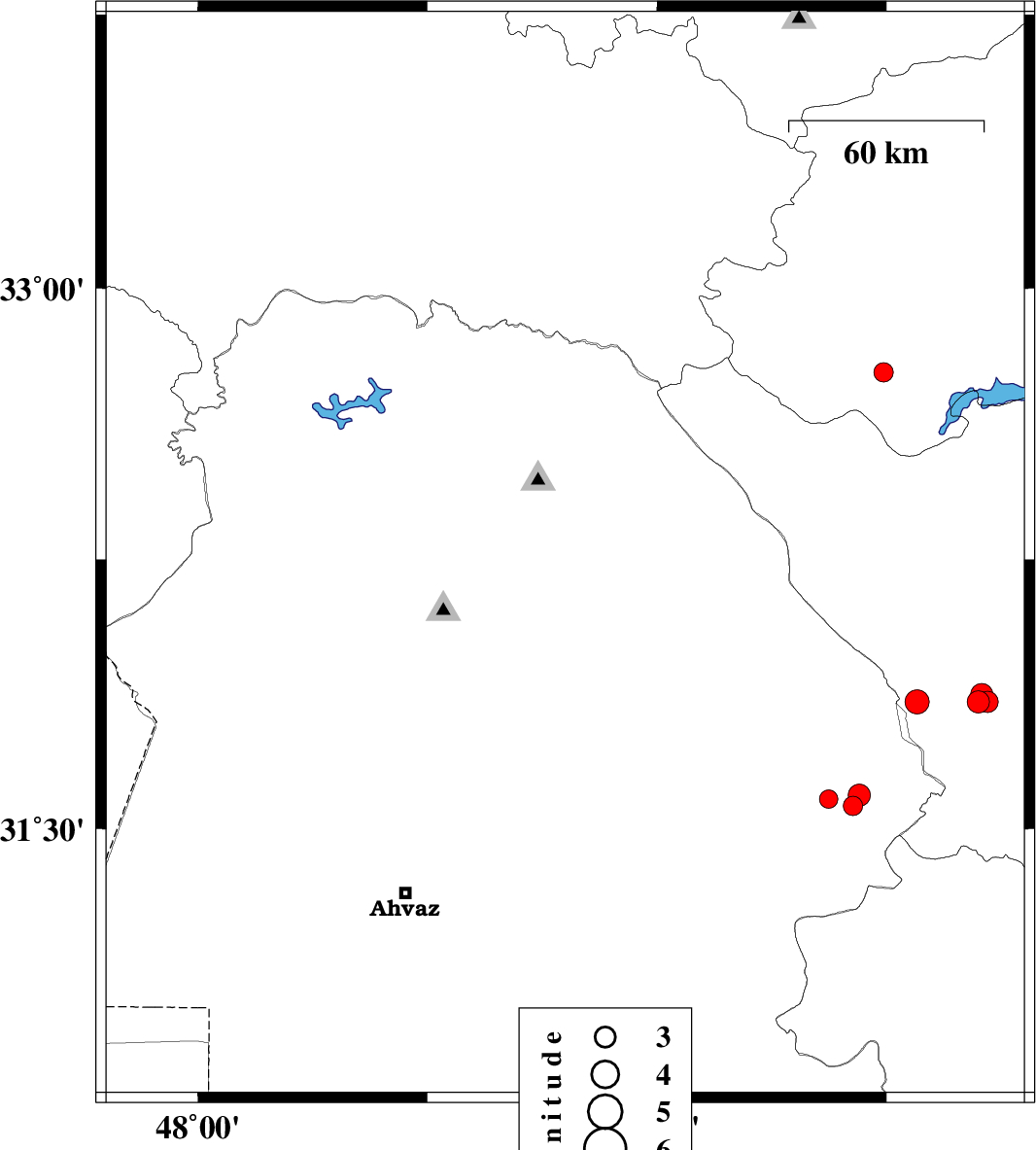 | 2007/09/10 | 07:38:14.1 | 11:08:14.1 | 32 | 48.81 | 10 | ML3.2 | 6 km Shushtar, Khoozestan Province |
