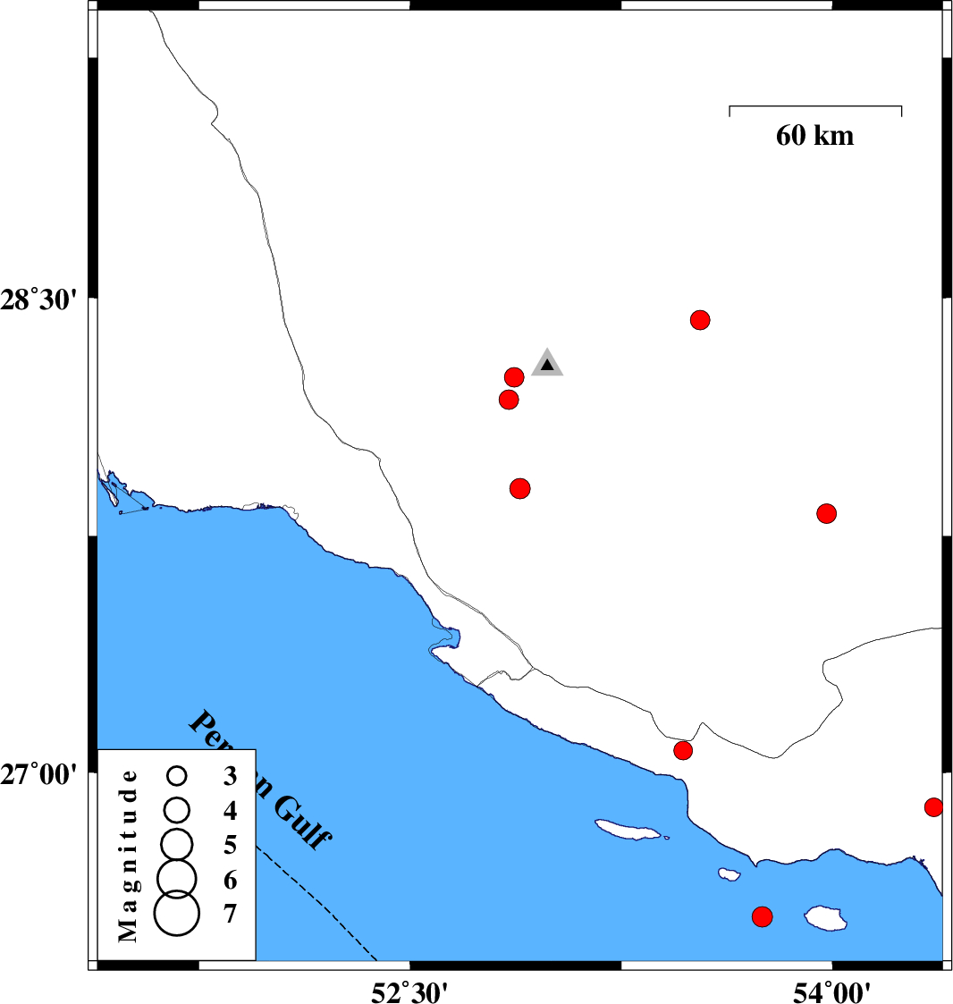 | 2007/09/18 | 04:38:54.2 | 08:08:54.2 | 26.89 | 54.36 | 35 | ML2.9 | 34 km South of Bastak, Hormozgan Province |