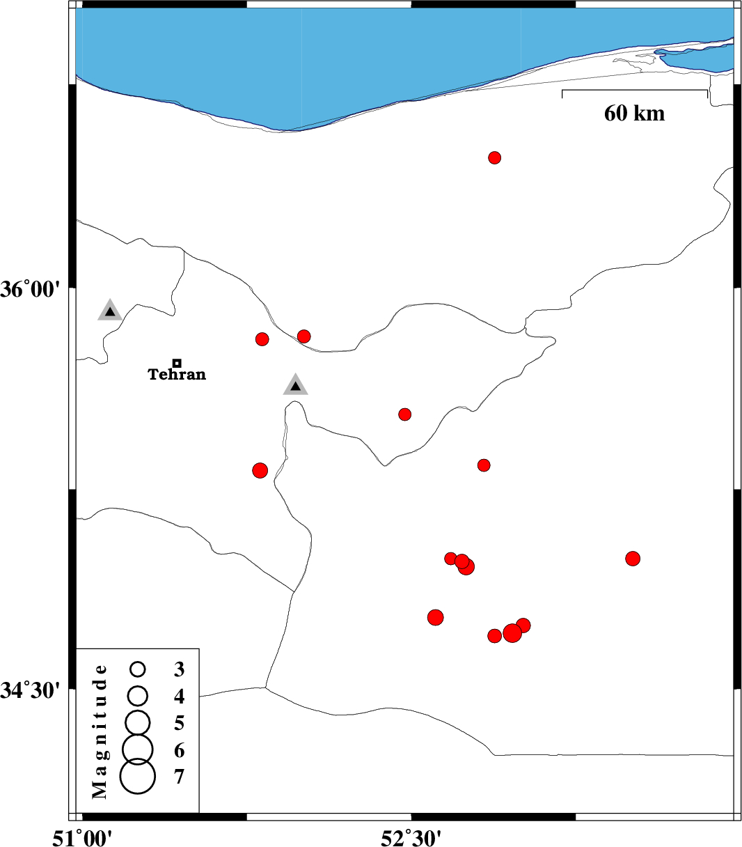 | 2007/10/08 | 02:34:52.1 | 06:04:52.1 | 34.71 | 52.96 | 18 | ML3.8 | 79 km South-East of Garmsar, Semnan Province | ||