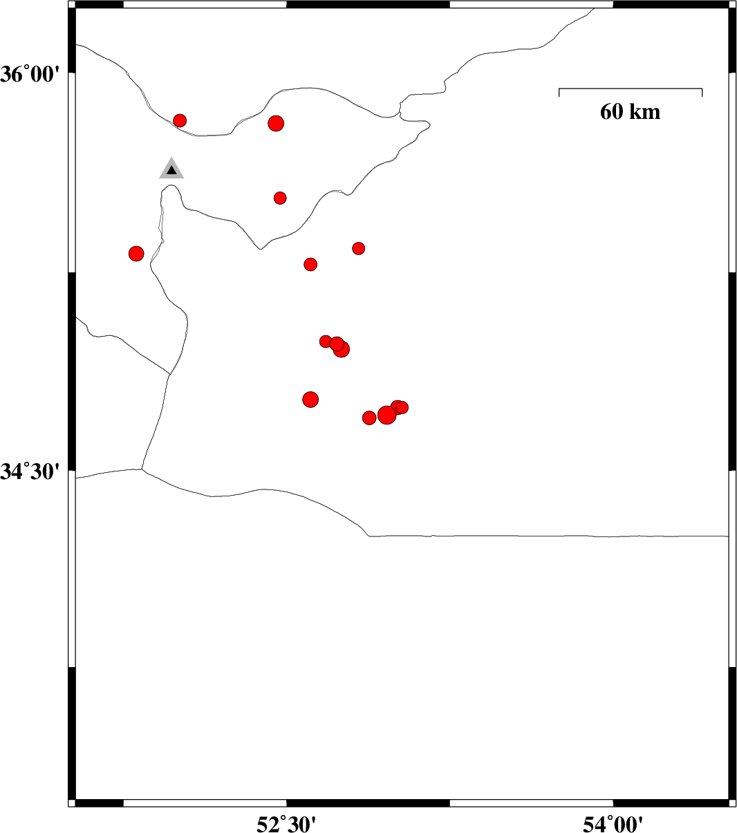 | 2007/09/19 | 06:02:33.1 | 09:32:33.1 | 34.99 | 52.68 | 15 | ML2.5 | 40 km South-East of Garmsar, Semnan Province |