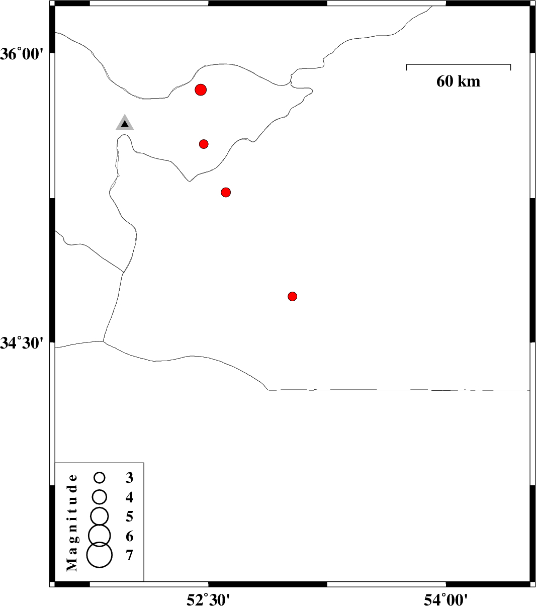 | 2007/10/19 | 16:43:35.9 | 20:13:35.9 | 35.28 | 52.61 | 6 | ML2.7 | 25 km East of Garmsar, Semnan Province | ||