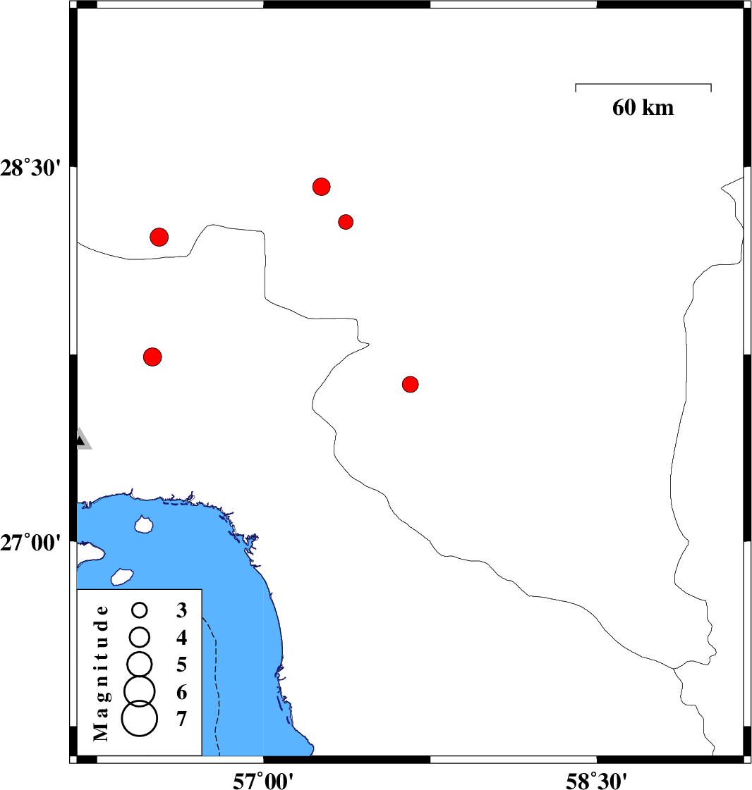 | 2007/10/15 | 00:19:01.4 | 03:49:01.4 | 28.28 | 57.37 | 36 | ML2.9 | 48 km North-West of Kahnuj, Kerman Province | ||