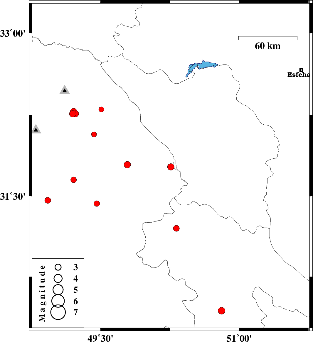 | 2007/10/09 | 00:15:08.4 | 03:45:08.4 | 32.28 | 49.21 | 15 | ML3.2 | 15 km South of Lali, Khoozestan Province |