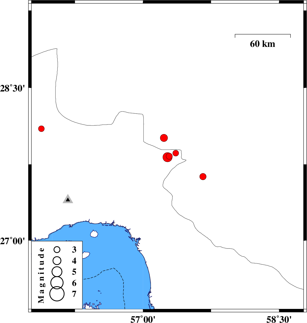 2007/11/18 | 18:37:50.3 | 22:07:50.3 | 27.83 | 57.29 | 44 | ML3.1 | 42 km South-West of Kahnuj, Kerman Province | ||