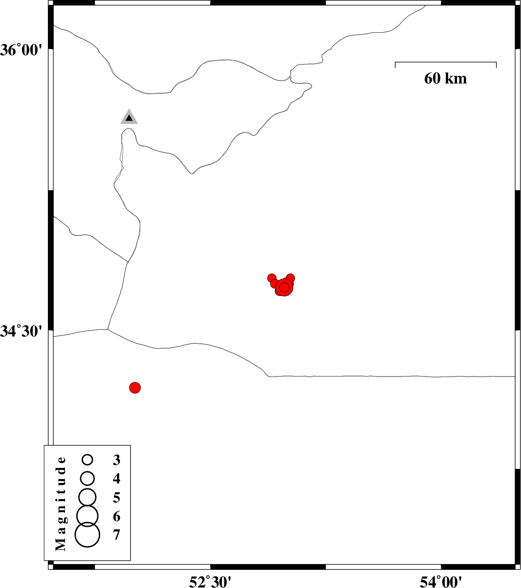 | 2007/11/19 | 12:24:01.2 | 15:54:01.2 | 34.73 | 53.06 | 14 | ML3.6 | 85 km South-East of Garmsar, Semnan Province | ||