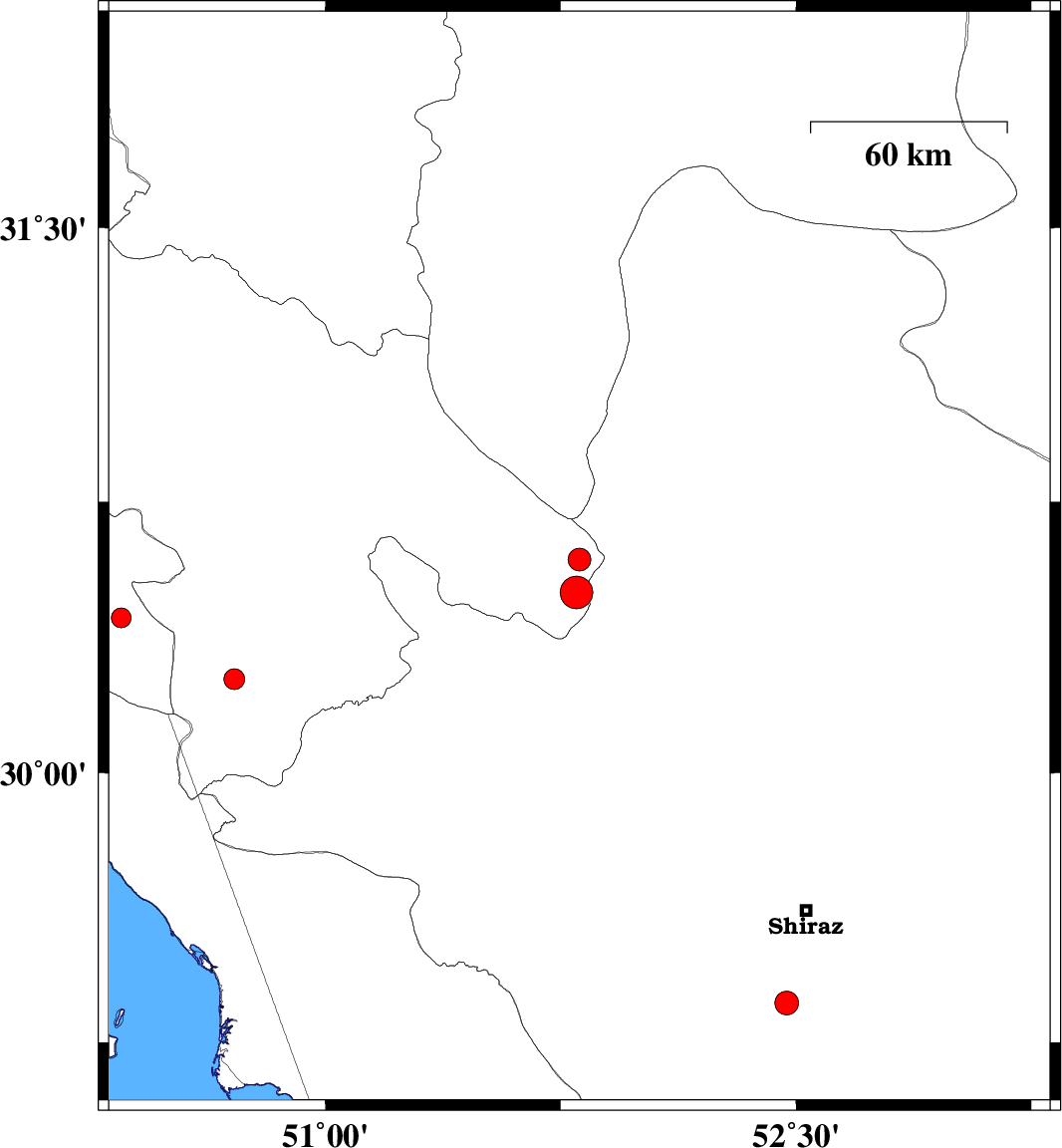 | 2007/11/15 | 02:37:41.1 | 06:07:41.1 | 29.36 | 52.47 | 46 | ML3.4 | 29 km South of Shiraz, Fars Province | ||