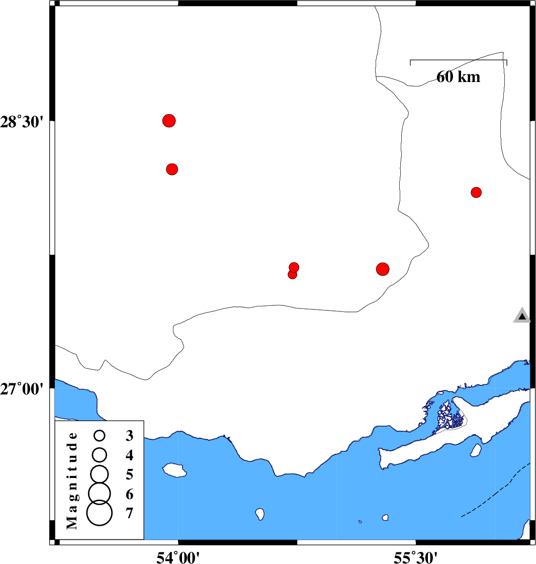 | 2007/11/20 | 09:15:34.7 | 12:45:34.7 | 27.64 | 54.72 | 15 | ML2.5 | 37 km East of Lar, Fars Province | ||