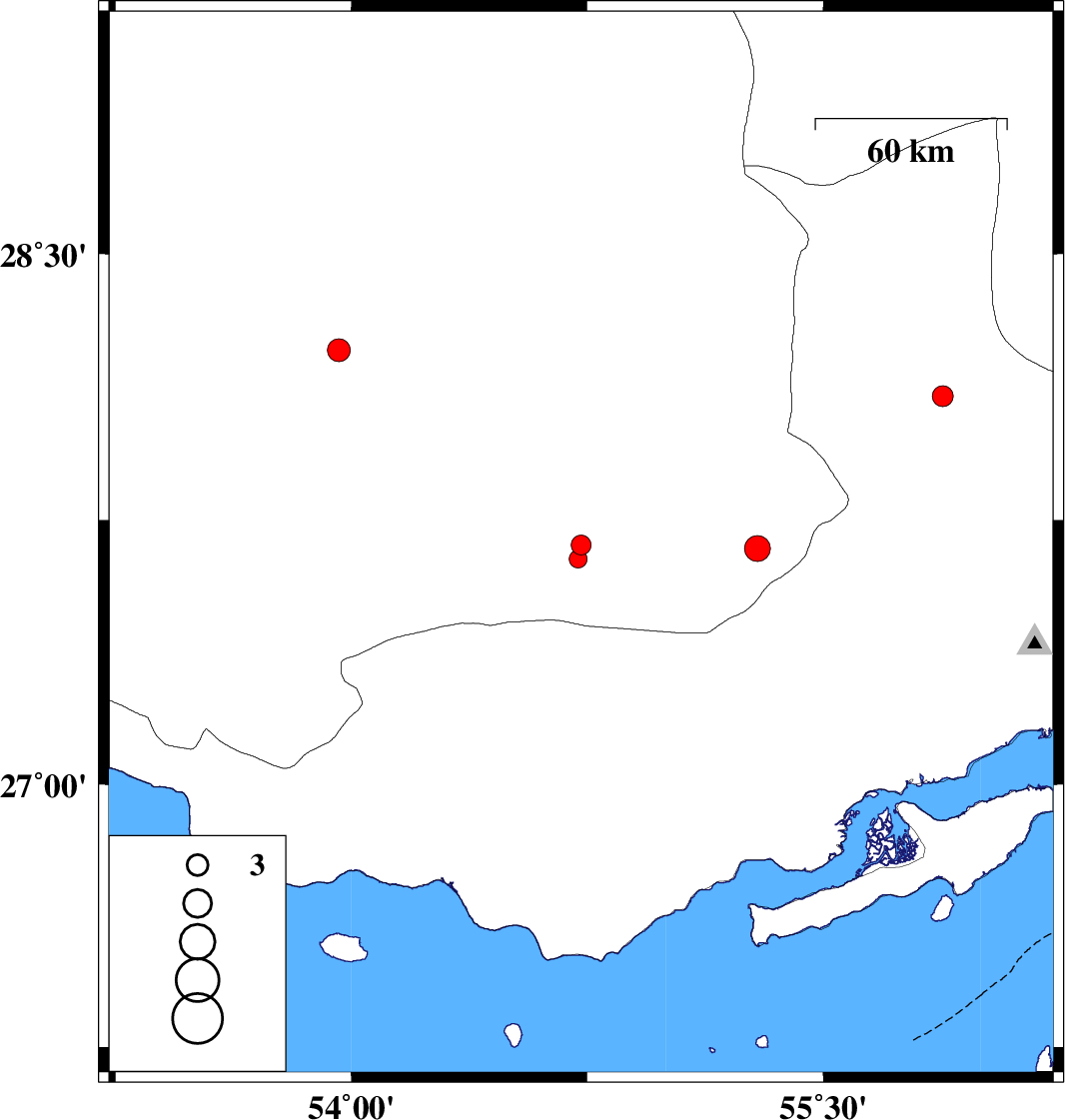 | 2007/11/18 | 18:22:43.7 | 21:52:43.7 | 28.1 | 55.88 | 46 | ML3 | 23 km South of Hajiabad, Hormozgan Province | ||