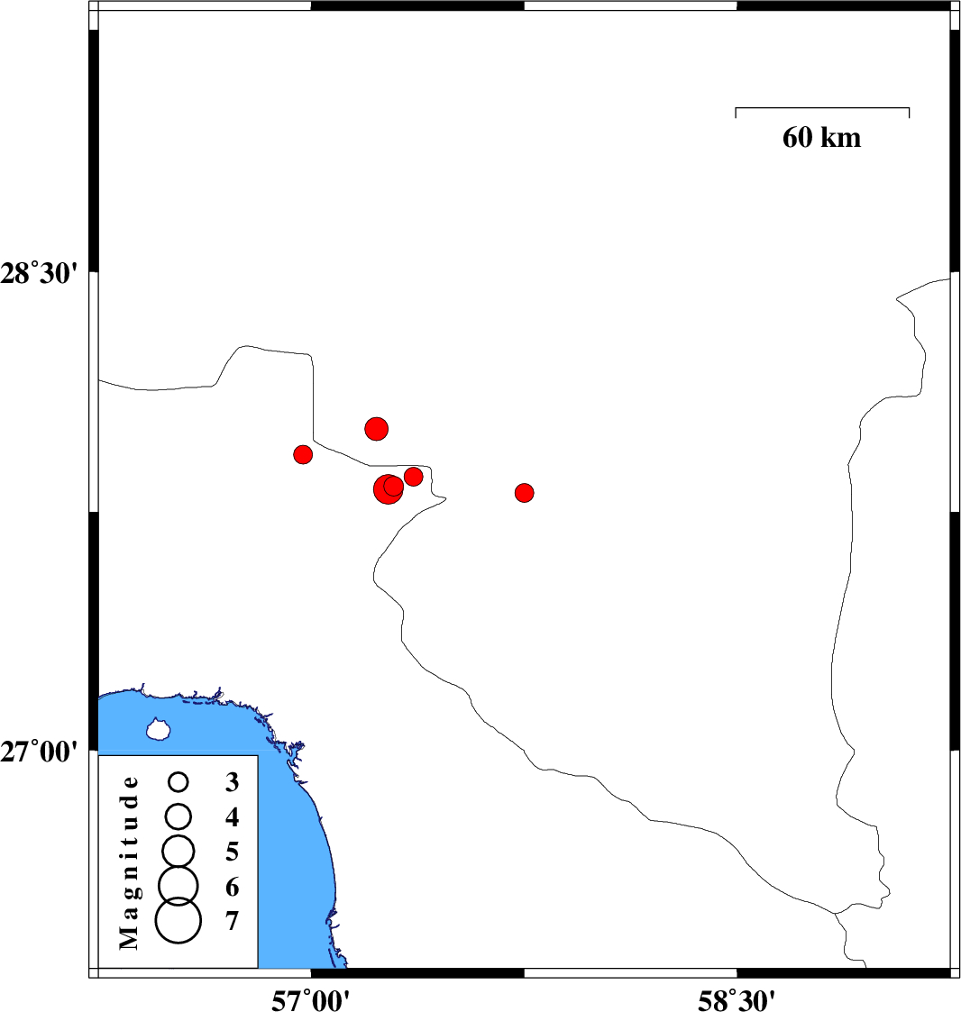 | 2007/11/17 | 15:26:46.7 | 18:56:46.7 | 28.01 | 57.23 | 32 | ML3.7 | 46 km West of Kahnuj, Kerman Province |