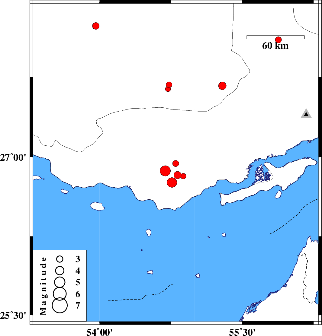 2007/11/22 05:45:46.8 09:15:46.8 26.8254.8818 ML2.7 32 km North of Bandar-e lengeh, Hormozgan Province