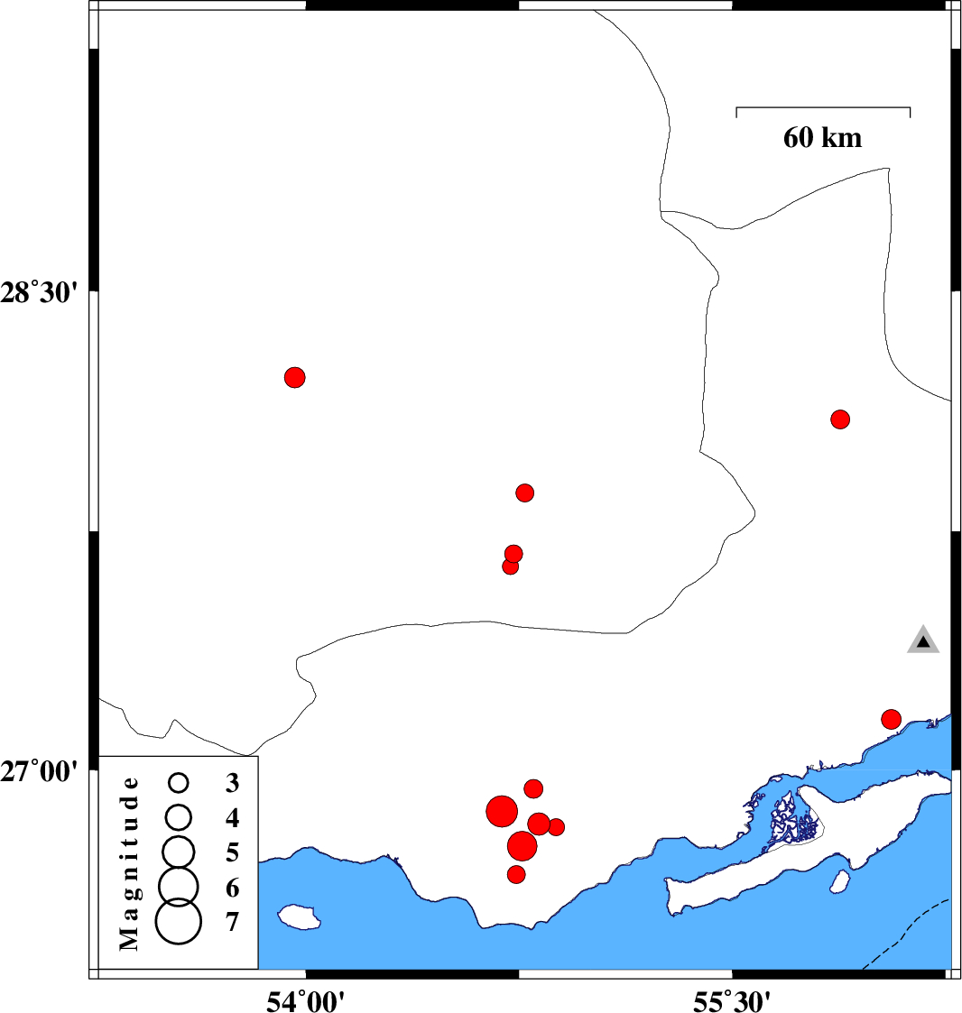 2007/11/22 | 05:08:39.0 | 08:38:39.0 | 26.94 | 54.8 | 16 | ML2.9 | 45 km North of Bandar-e lengeh, Hormozgan Province | ||