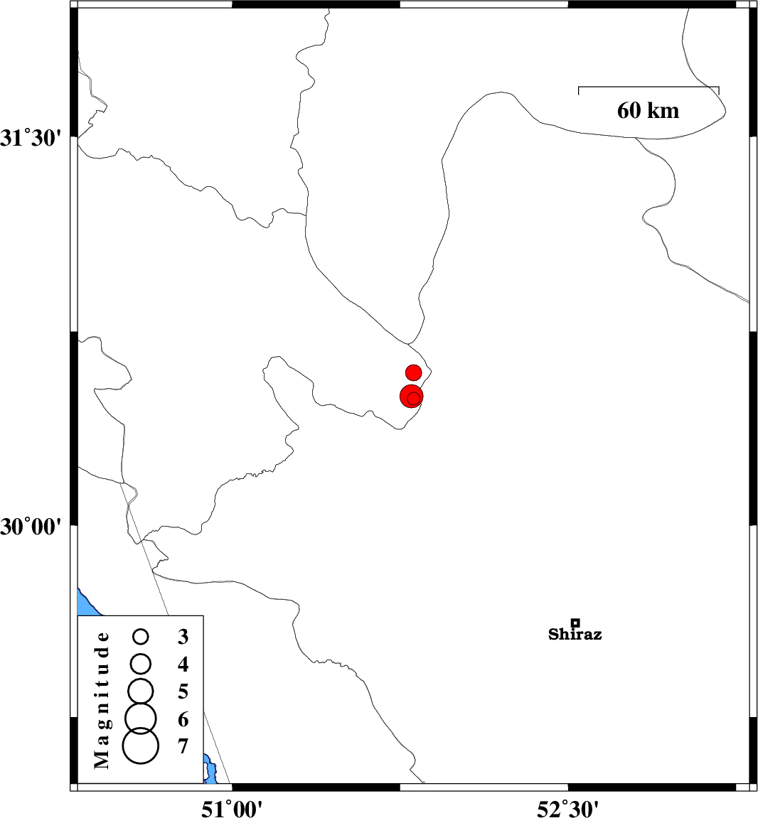 2007/11/19 | 18:25:18.1 | 21:55:18.1 | 30.5 | 51.8 | 15 | ML4.7 | 29 km South-East of Yasuj, Kohkiluieh va boyerahmad Province |