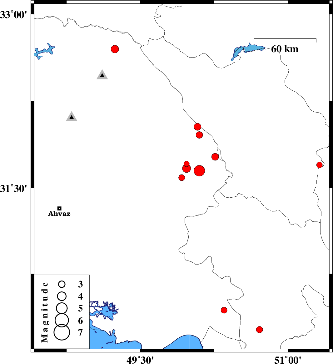 2007/11/21 | 08:04:26.1 | 11:34:26.1 | 31.67 | 49.97 | 18 | ML3.8 | 18 km North of Bagh Malek, Khoozestan Province | ||