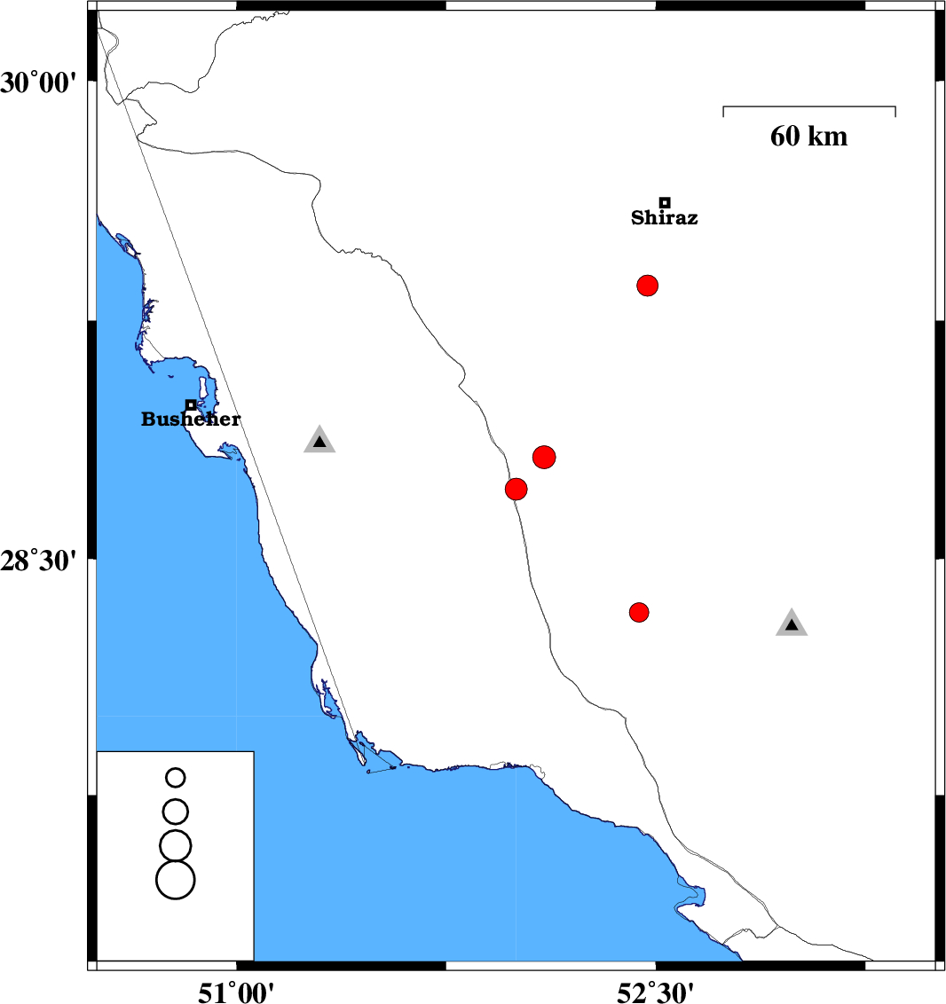 2007/11/15 | 02:37:41.1 | 06:07:41.1 | 29.36 | 52.47 | 46 | ML3.4 | 29 km South of Shiraz, Fars Province |