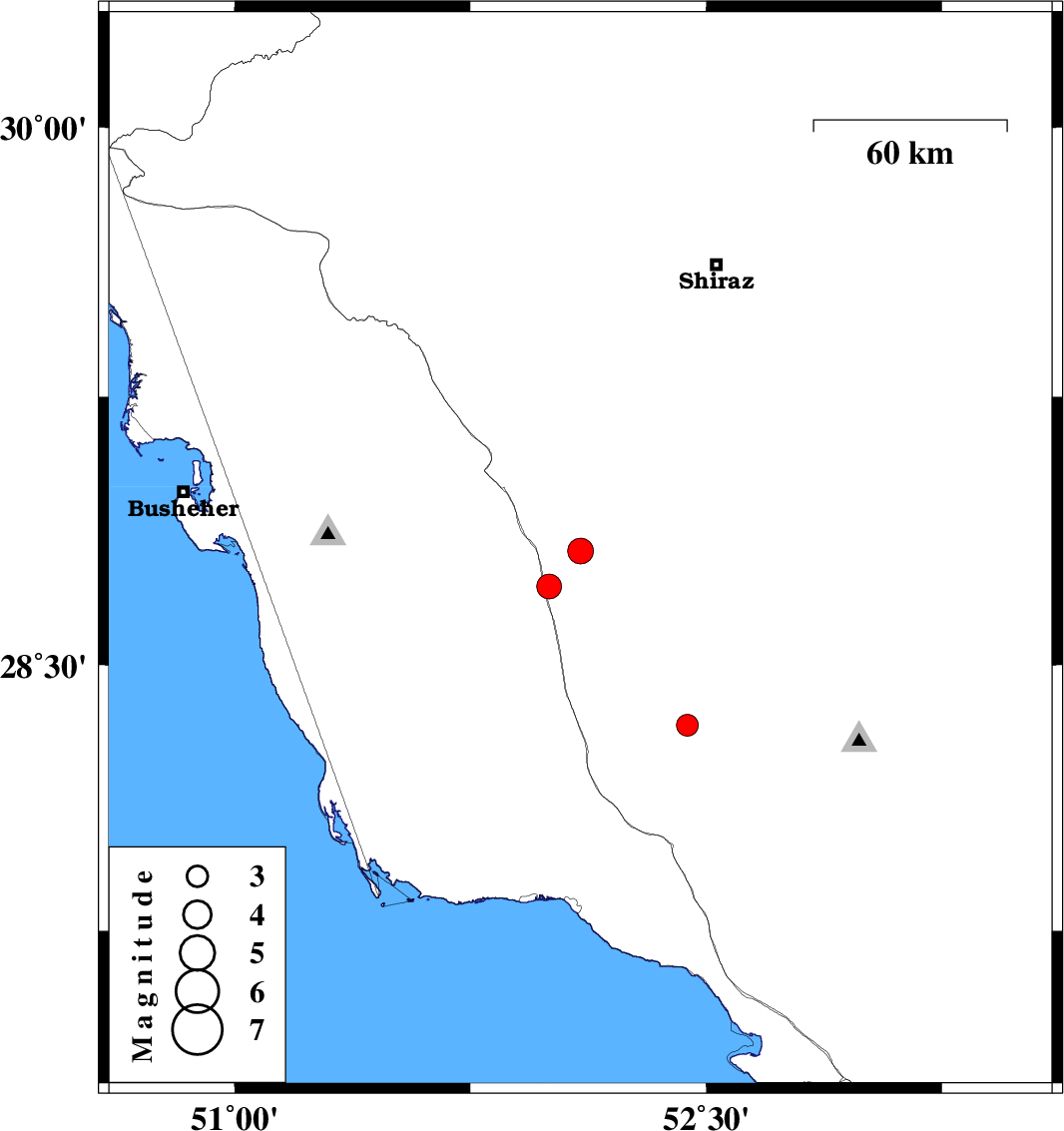 2007/12/04 | 13:59:16.9 | 17:29:16.9 | 28.33 | 52.44 | 14 | ML3.1 | 56 km North-East of Jam, Bushehr Province |