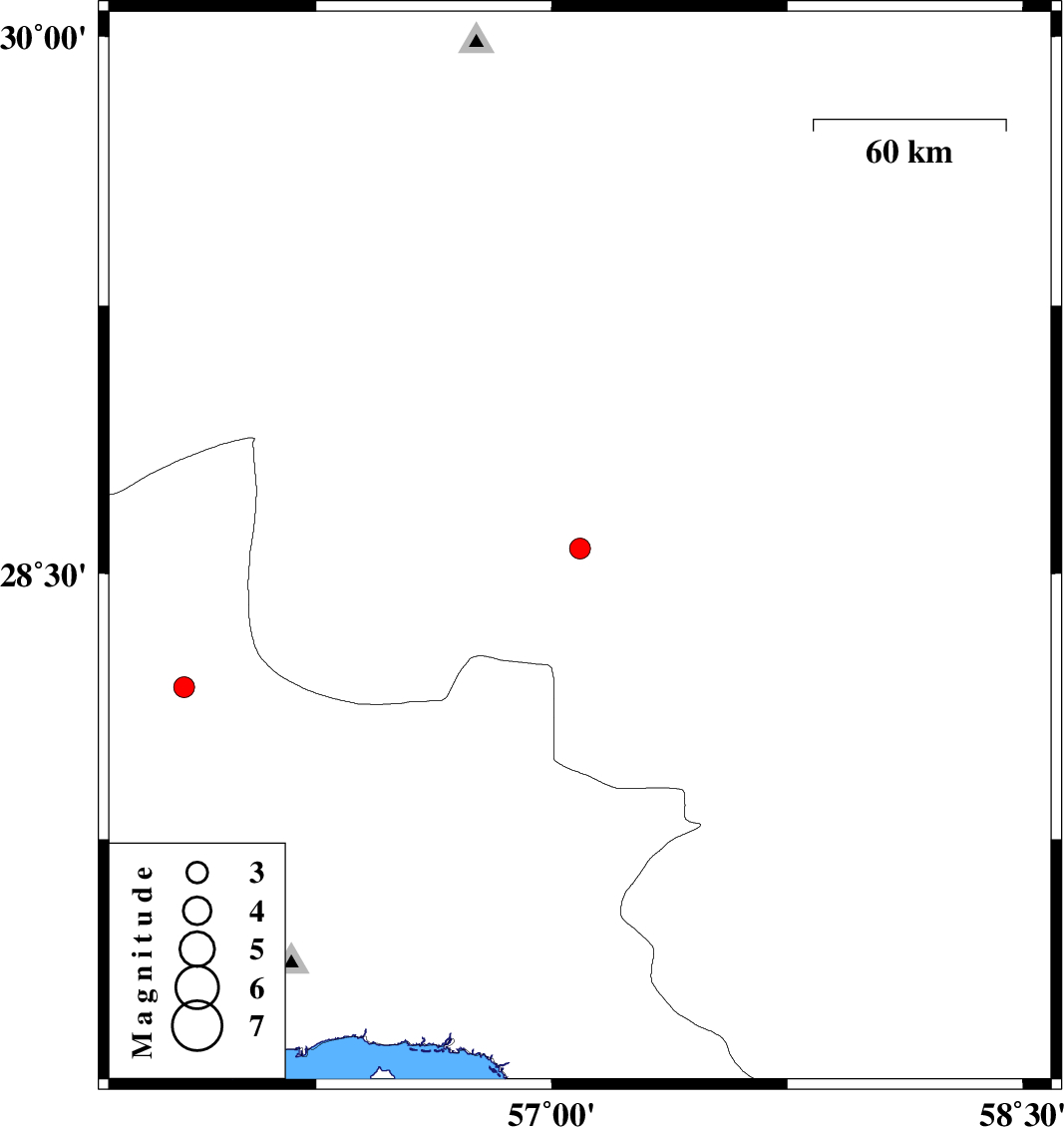 | 2007/12/09 | 23:43:10.6 | 03:13:10.6 | 28.57 | 57.09 | 17 | ML2.9 | 63 km South-West of Jiroft, Kerman Province | ||