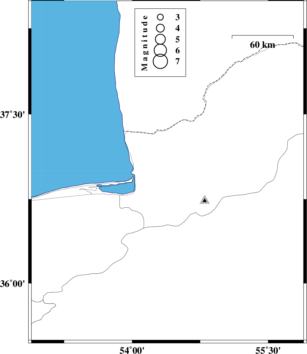 | 2007/12/10 | 23:49:56.8 | 03:19:56.8 | 36.99 | 54.39 | 14 | ML2.9 | 6 km Aq Qaleh, Golestan Province |