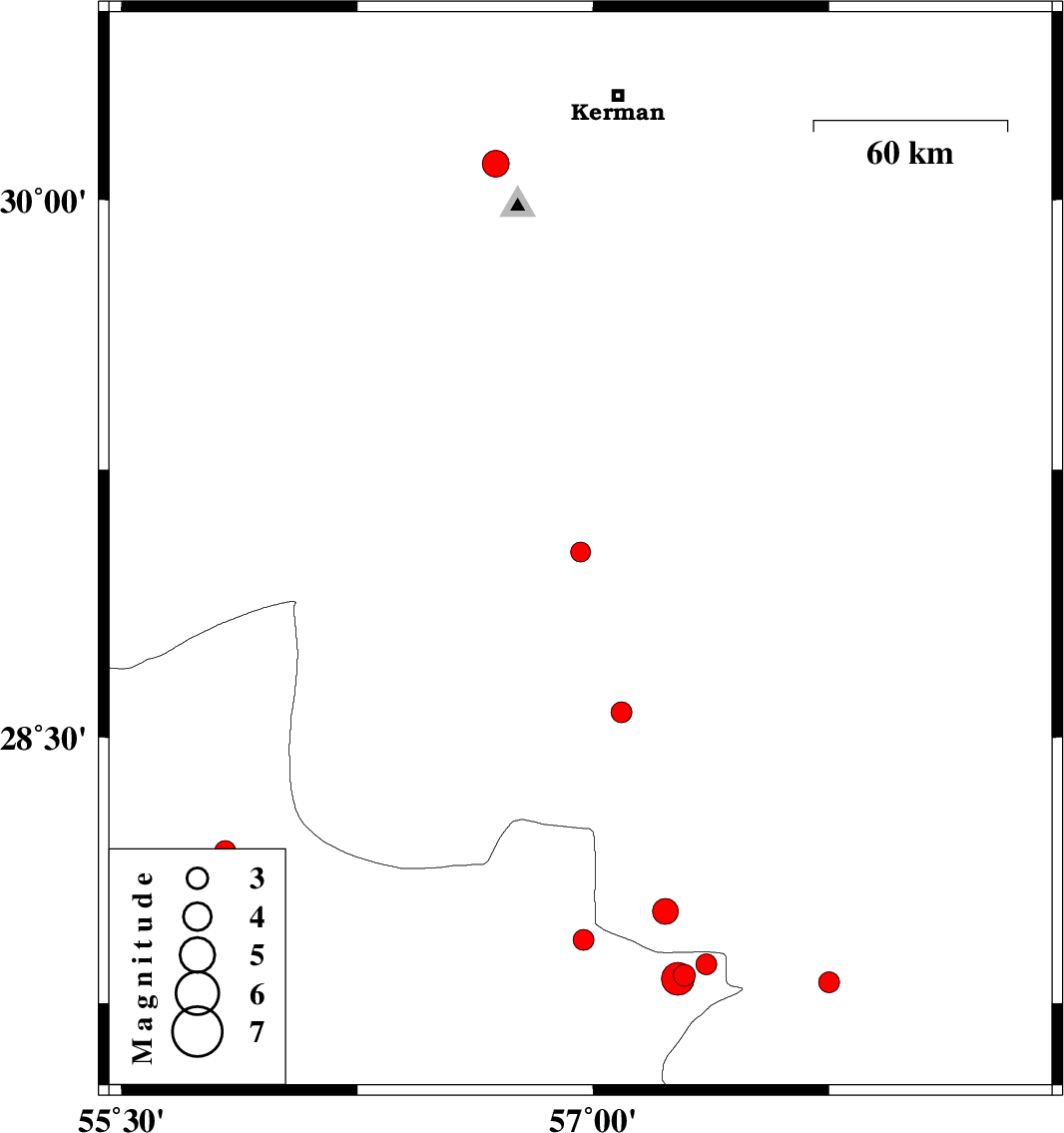 2007/11/18 | 16:36:41.6 | 20:06:41.6 | 27.86 | 57.36 | 36 | ML3 | 34 km West of Kahnuj, Kerman Province | ||