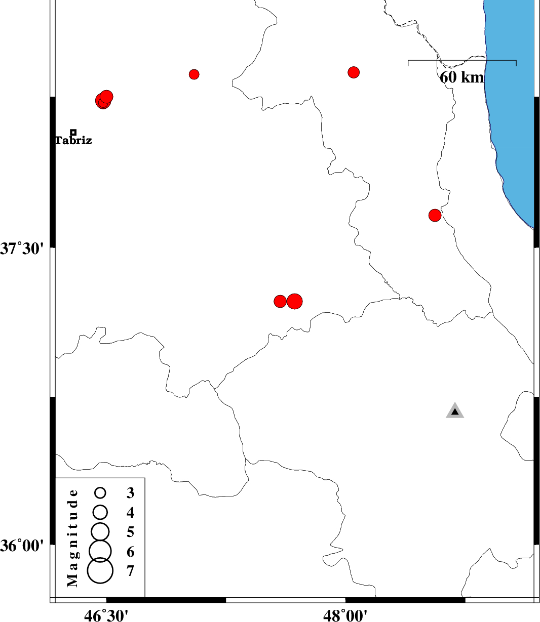| 2007/12/02 | 10:00:01.4 | 13:30:01.4 | 38.25 | 46.5 | 14 | ML3.6 | 26 km North-East of Tabriz, Azarbaijan Sharghi Province | ||
