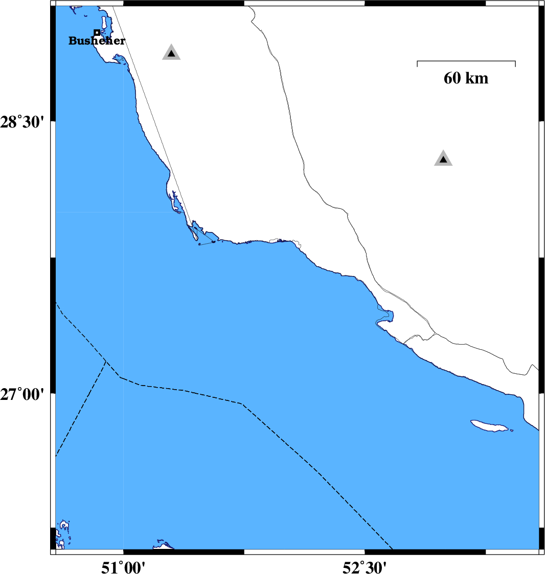 2007/12/18 | 01:02:21.2 | 04:32:21.2 | 27.63 | 52.08 | 24 | ML3.7 | Persian Gulf, 21 km South of Bandar-e kangan | ||
