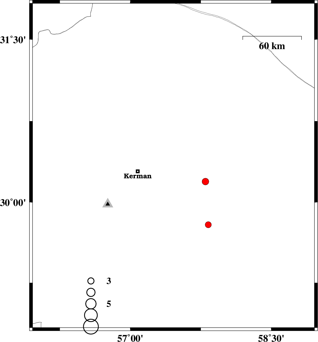 | 2007/12/13 | 01:05:05.1 | 04:35:05.1 | 29.93 | 57.49 | 15 | ML2.9 | 55 km South-East of Kerman, Kerman Province |