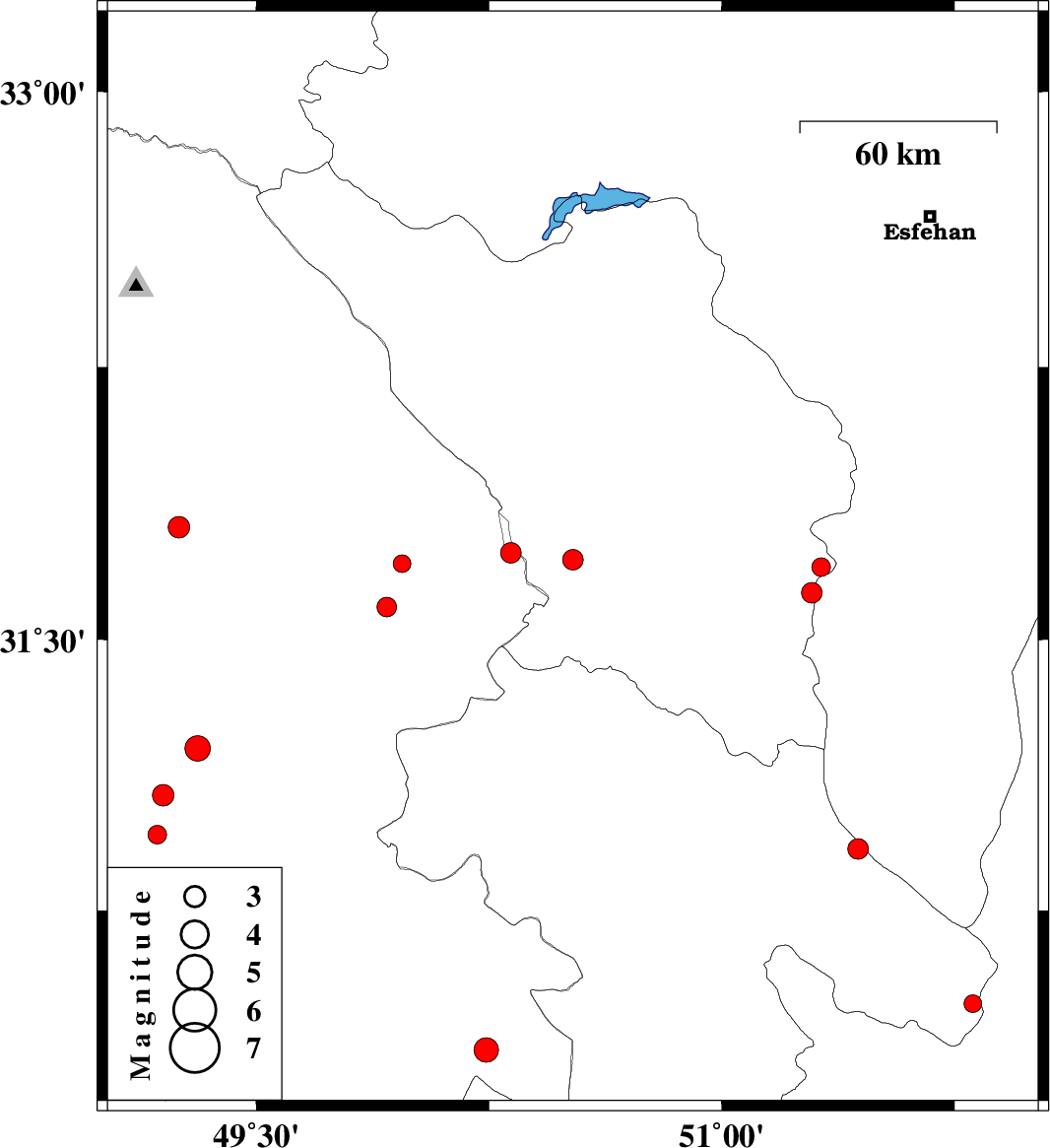 2007/11/27 | 02:44:19.9 | 06:14:19.9 | 31.7 | 51.32 | 14 | ML2.7 | 30 km South of Borujen, Chaharmahal Bakhtiari Province | ||