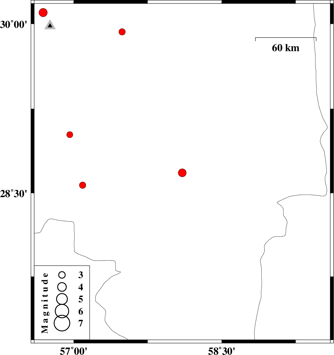2007/12/13 | 01:05:05.1 | 04:35:05.1 | 29.93 | 57.49 | 15 | ML2.9 | 55 km South-East of Kerman, Kerman Province | ||