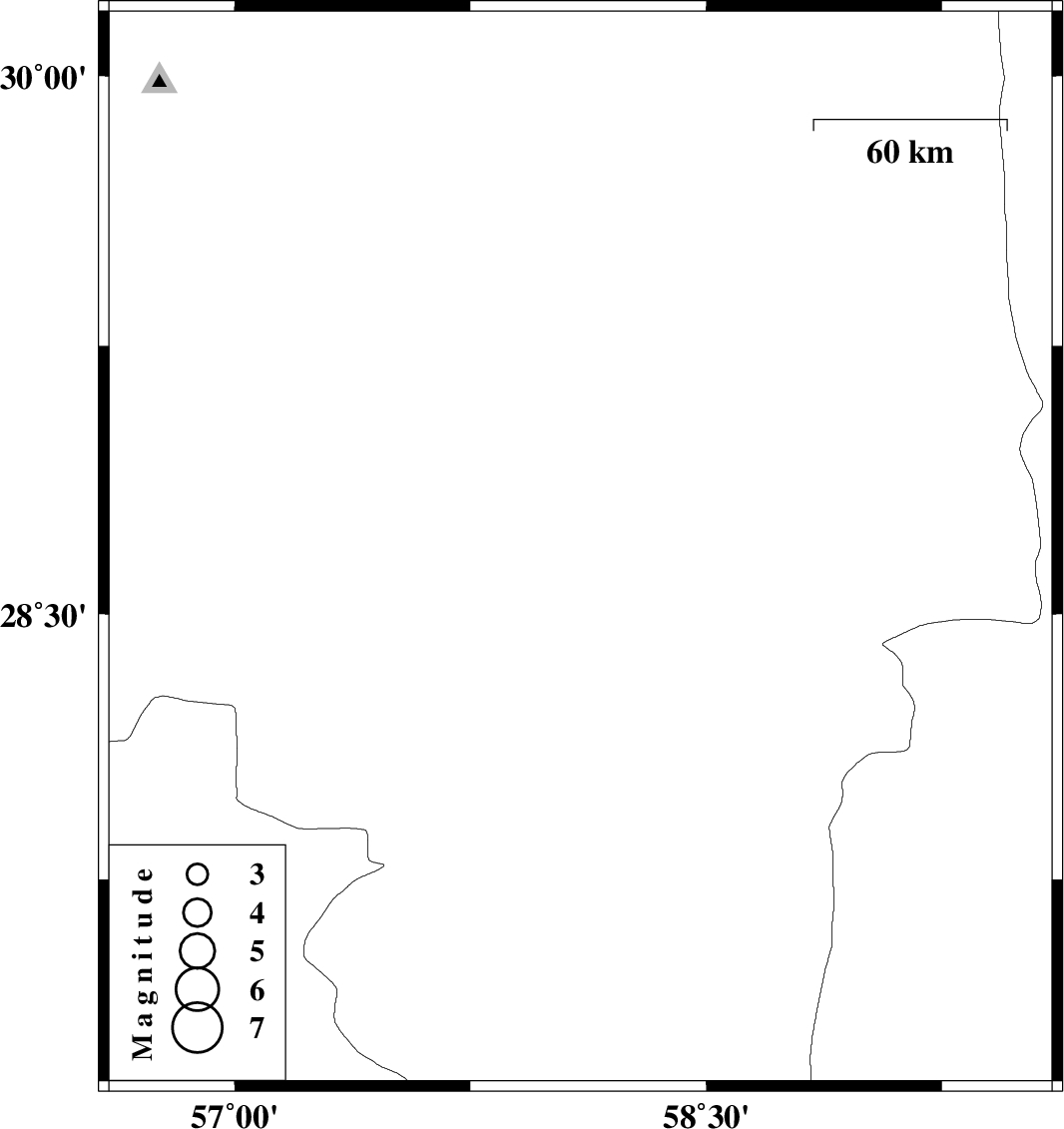 2007/12/22 | 10:04:39.7 | 13:34:39.7 | 28.68 | 58.1 | 14 | ML3.6 | 35 km East of Jiroft, Kerman Province |