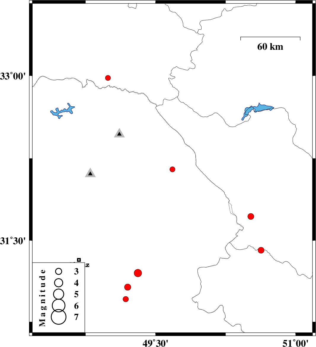 | 2007/12/19 | 18:07:52.3 | 21:37:52.3 | 32.98 | 48.99 | 16 | ML2.5 | 56 km South of Dorud, Lorestan Province | ||
