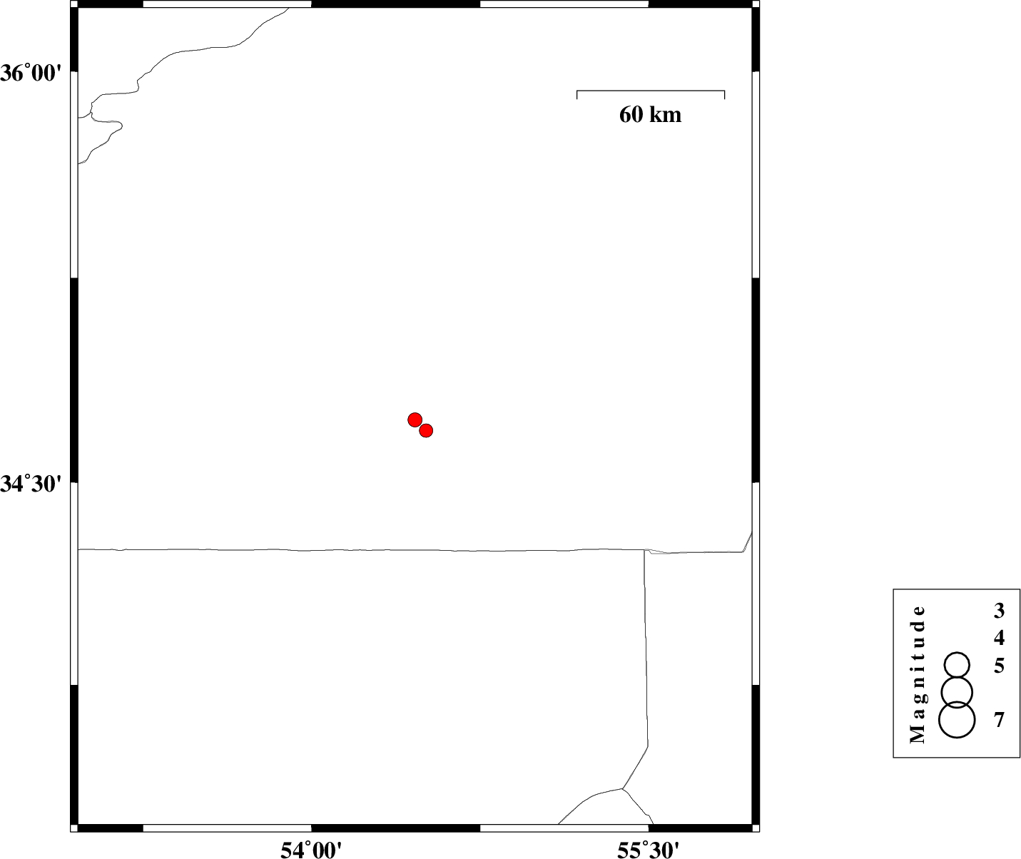 | 2007/12/23 | 12:05:39.0 | 15:35:39.0 | 34.69 | 54.51 | 18 | ML2.7 | 140 km South-East of Semnan, Semnan Province |