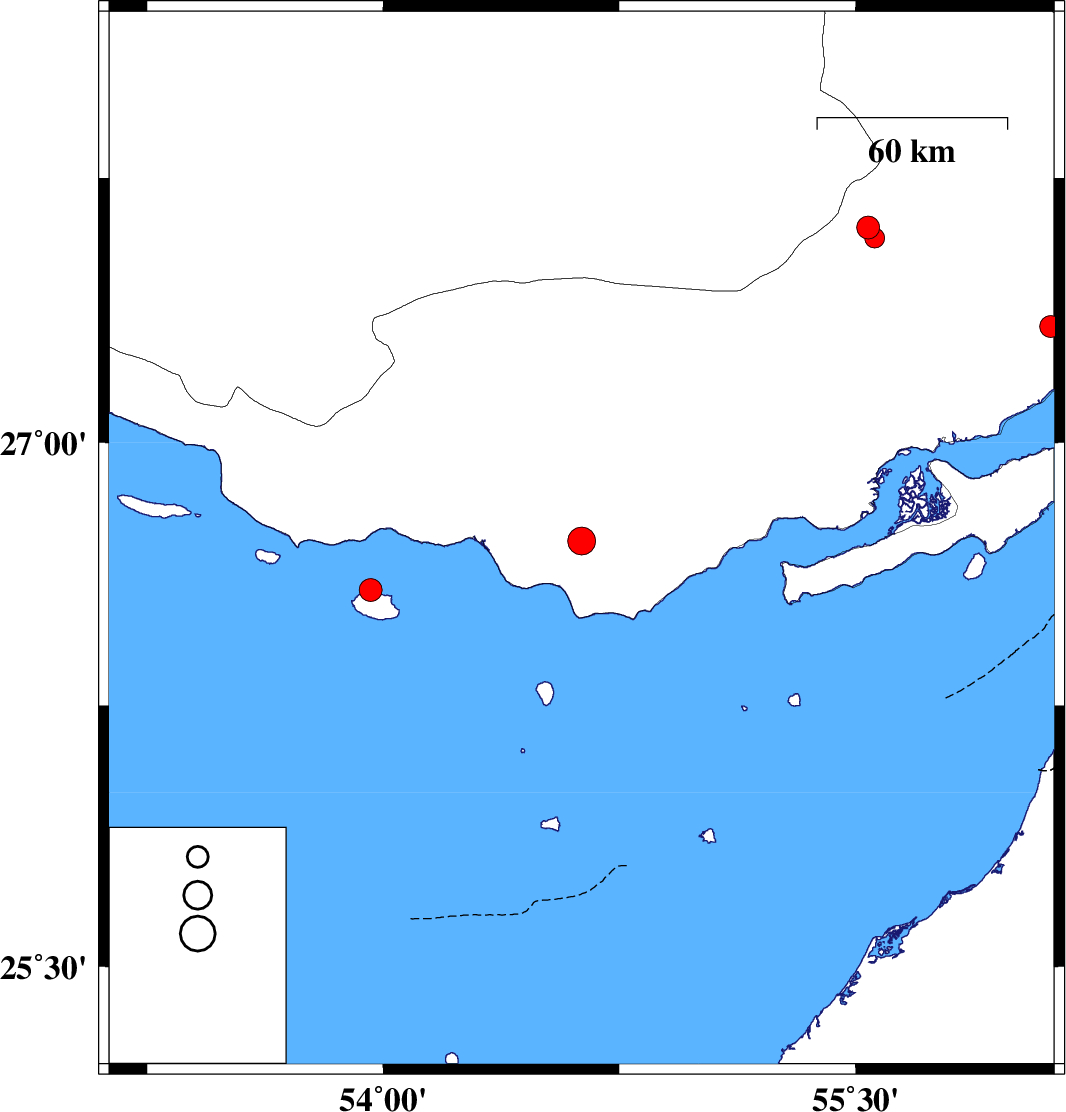 2007/12/18 | 17:53:51.1 | 21:23:51.1 | 26.58 | 53.96 | 14 | ML3.2 | Persian Gulf, 79 km South-West of Bastak | ||