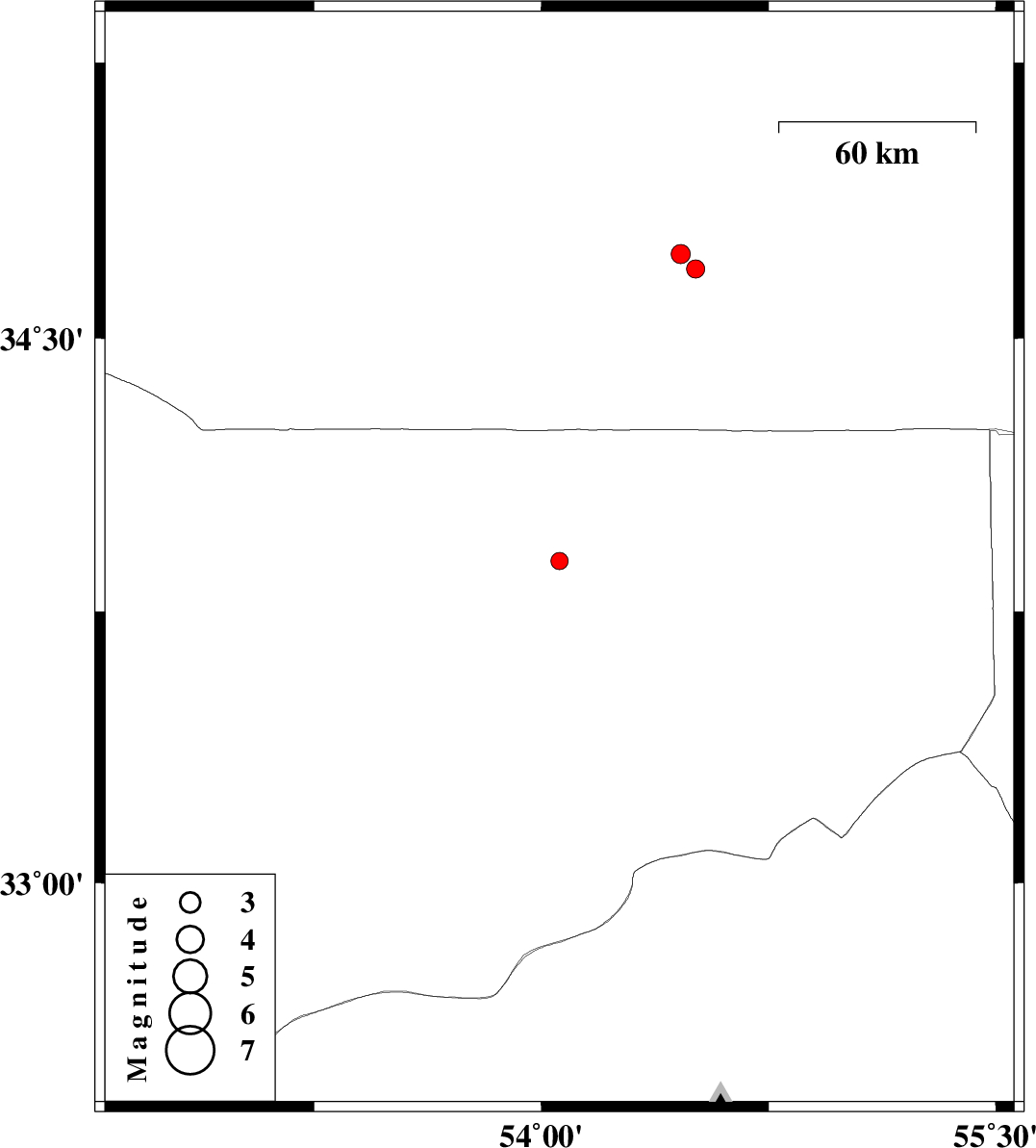 | 2007/12/23 | 12:05:39.0 | 15:35:39.0 | 34.69 | 54.51 | 18 | ML2.7 | 140 km South-East of Semnan, Semnan Province |
