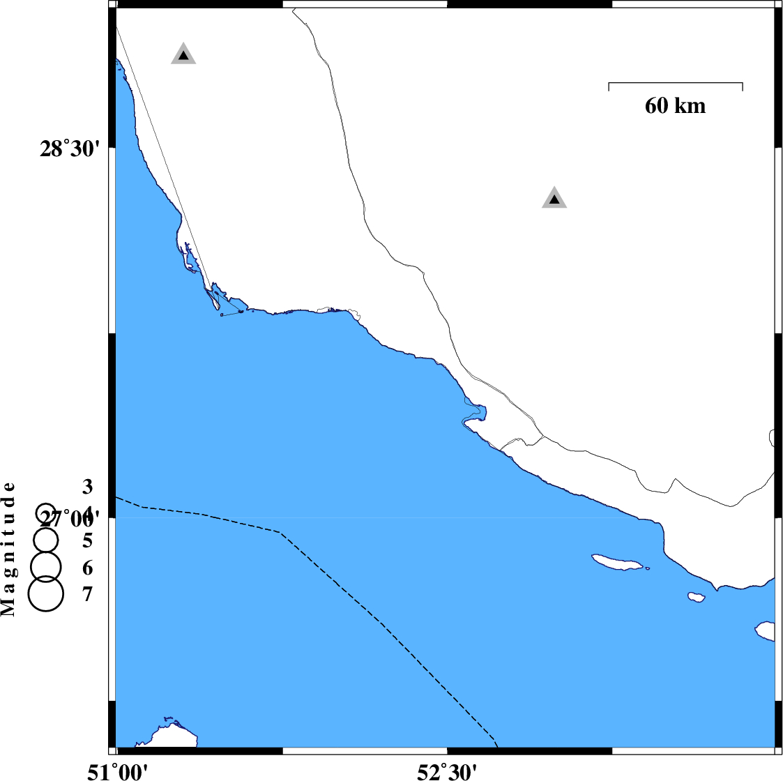 2007/12/29 | 02:58:43.4 | 06:28:43.4 | 27.56 | 52.49 | 31 | ML2.8 | Persian Gulf, 35 km South-East of Jam |