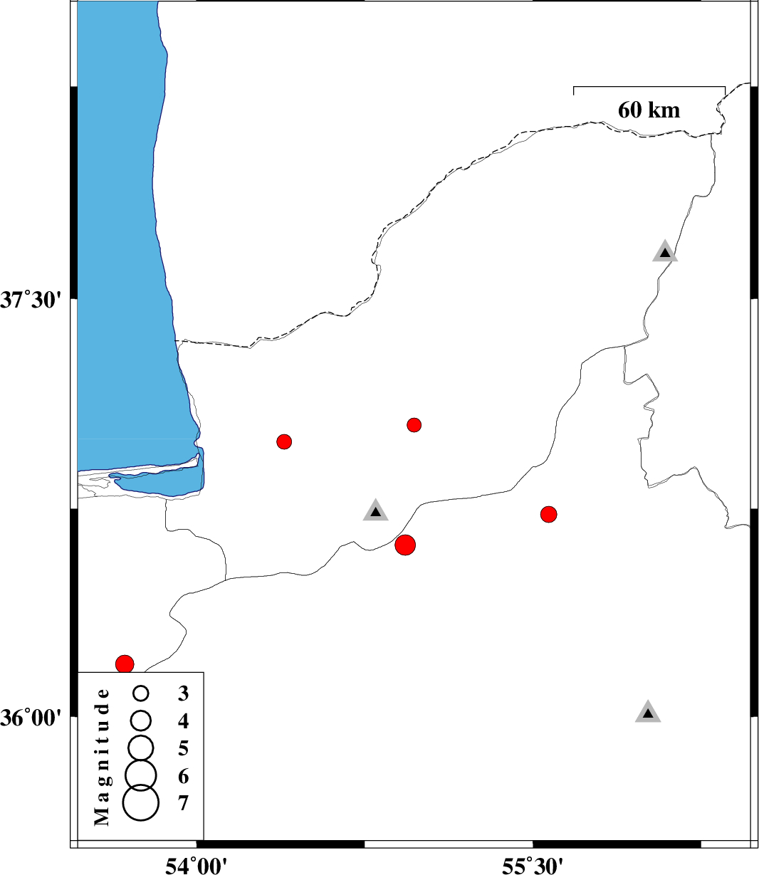 | 2007/12/10 | 23:49:56.8 | 03:19:56.8 | 36.99 | 54.39 | 14 | ML2.9 | 6 km Aq Qaleh, Golestan Province |