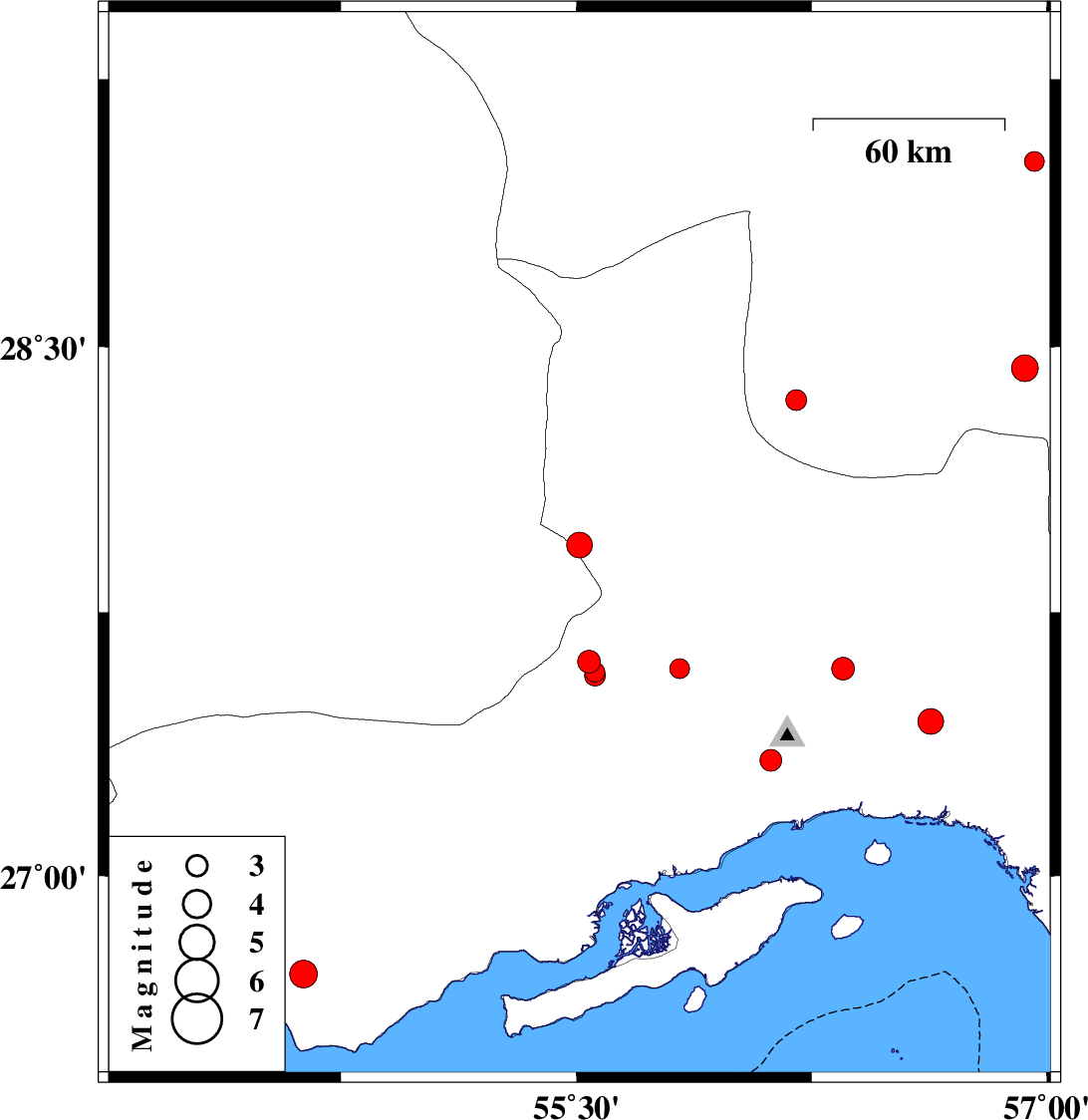 2007/12/13 | 01:34:26.5 | 05:04:26.5 | 27.59 | 55.83 | 14 | ML2.8 | 63 km North-West of Bandar-e abbas, Hormozgan Province | ||