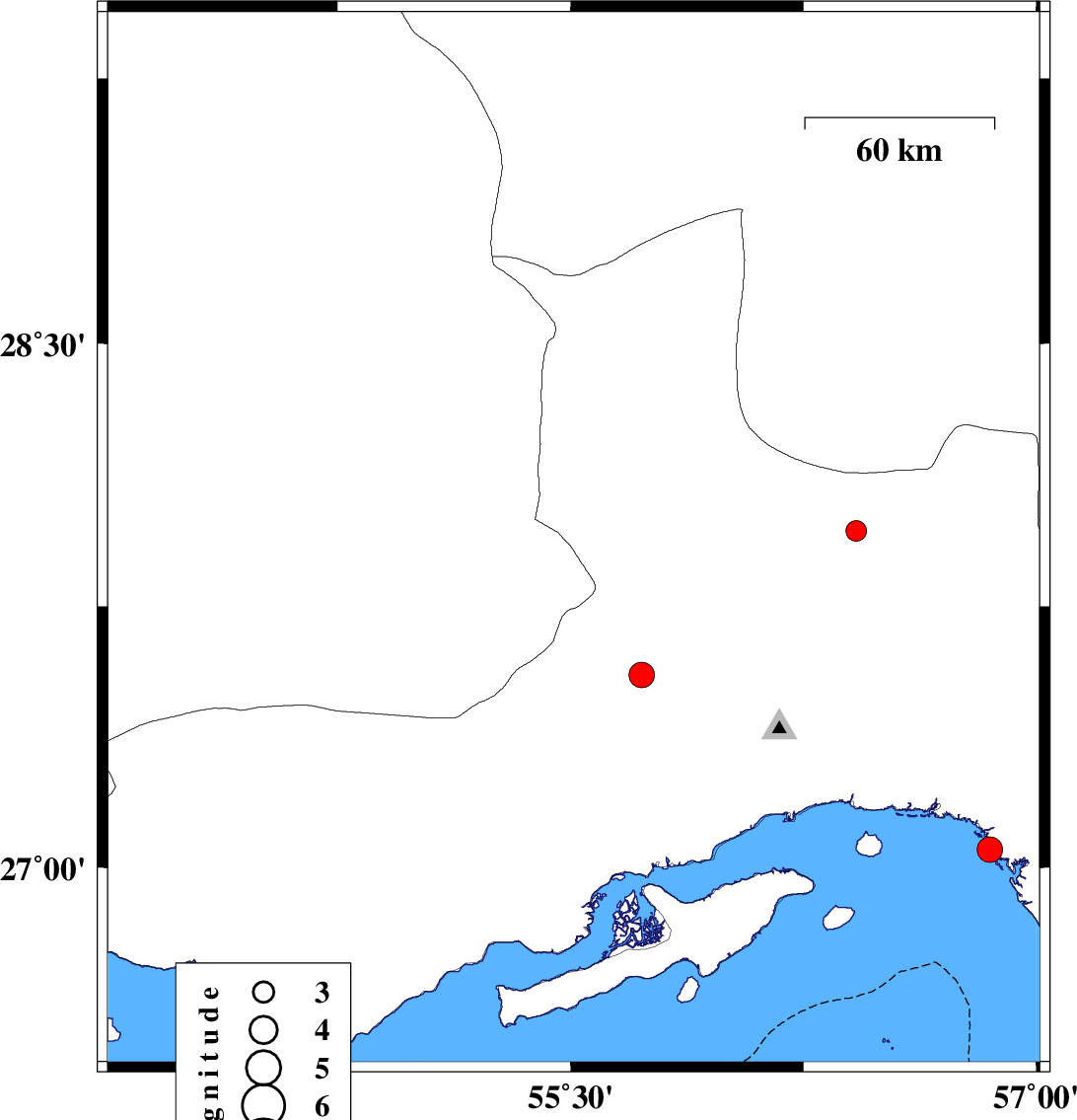 2007/12/28 | 17:11:41.2 | 20:41:41.2 | 27.44 | 56.63 | 13 | ML3.7 | 44 km North-East of Bandar-e abbas, Hormozgan Province | ||