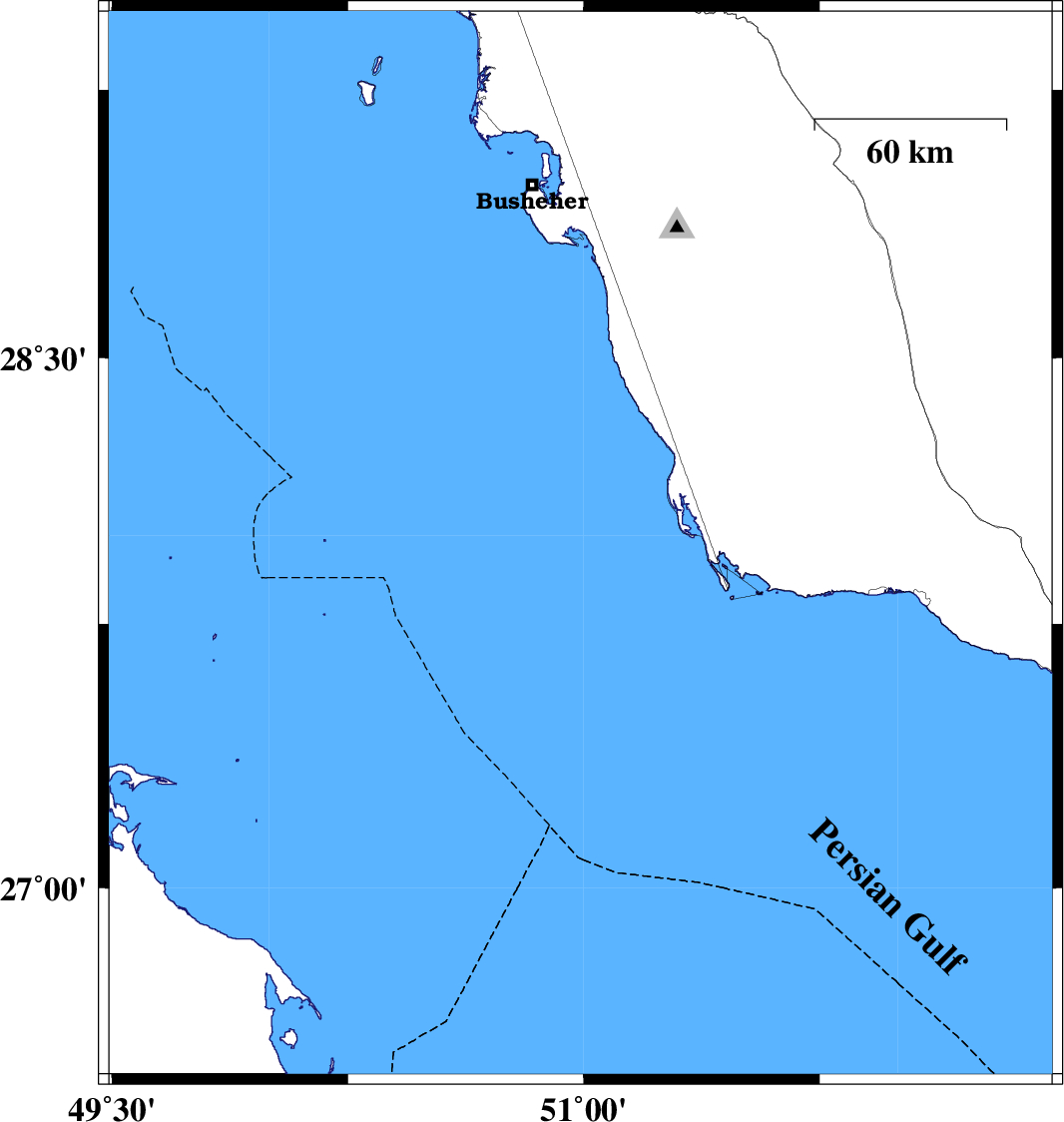 | 2007/12/29 | 02:58:43.4 | 06:28:43.4 | 27.56 | 52.49 | 31 | ML2.8 | Persian Gulf, 35 km South-East of Jam |