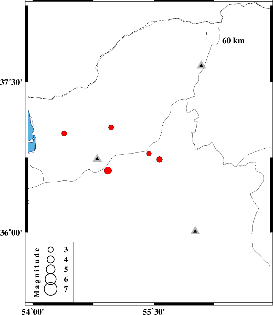 | 2007/12/10 | 23:49:56.8 | 03:19:56.8 | 36.99 | 54.39 | 14 | ML2.9 | 6 km Aq Qaleh, Golestan Province |