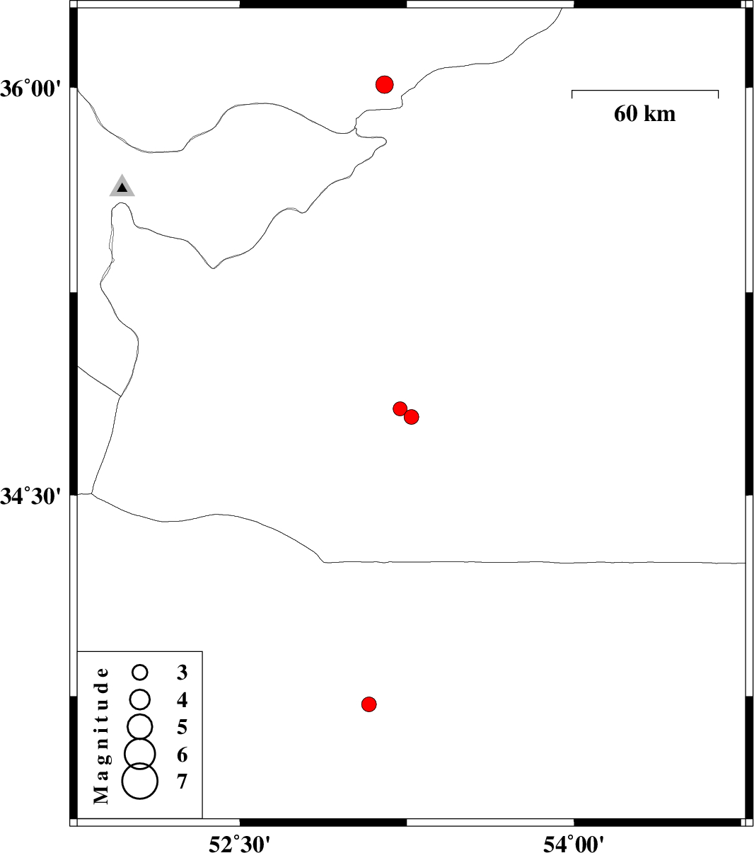 | 2008/01/09 | 00:30:12.1 | 04:00:12.1 | 34.79 | 53.27 | 14 | ML2.9 | 86 km South-West of Semnan, Semnan Province | ||