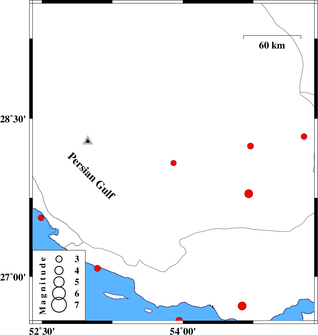 2007/12/29 | 02:58:43.4 | 06:28:43.4 | 27.56 | 52.49 | 31 | ML2.8 | Persian Gulf, 35 km South-East of Jam | ||