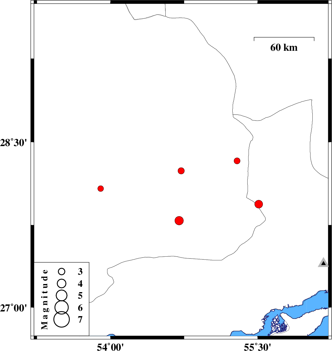 2008/01/05 | 00:37:47.2 | 04:07:47.2 | 27.79 | 54.7 | 14 | ML4 | 37 km North-East of Lar, Fars Province | ||