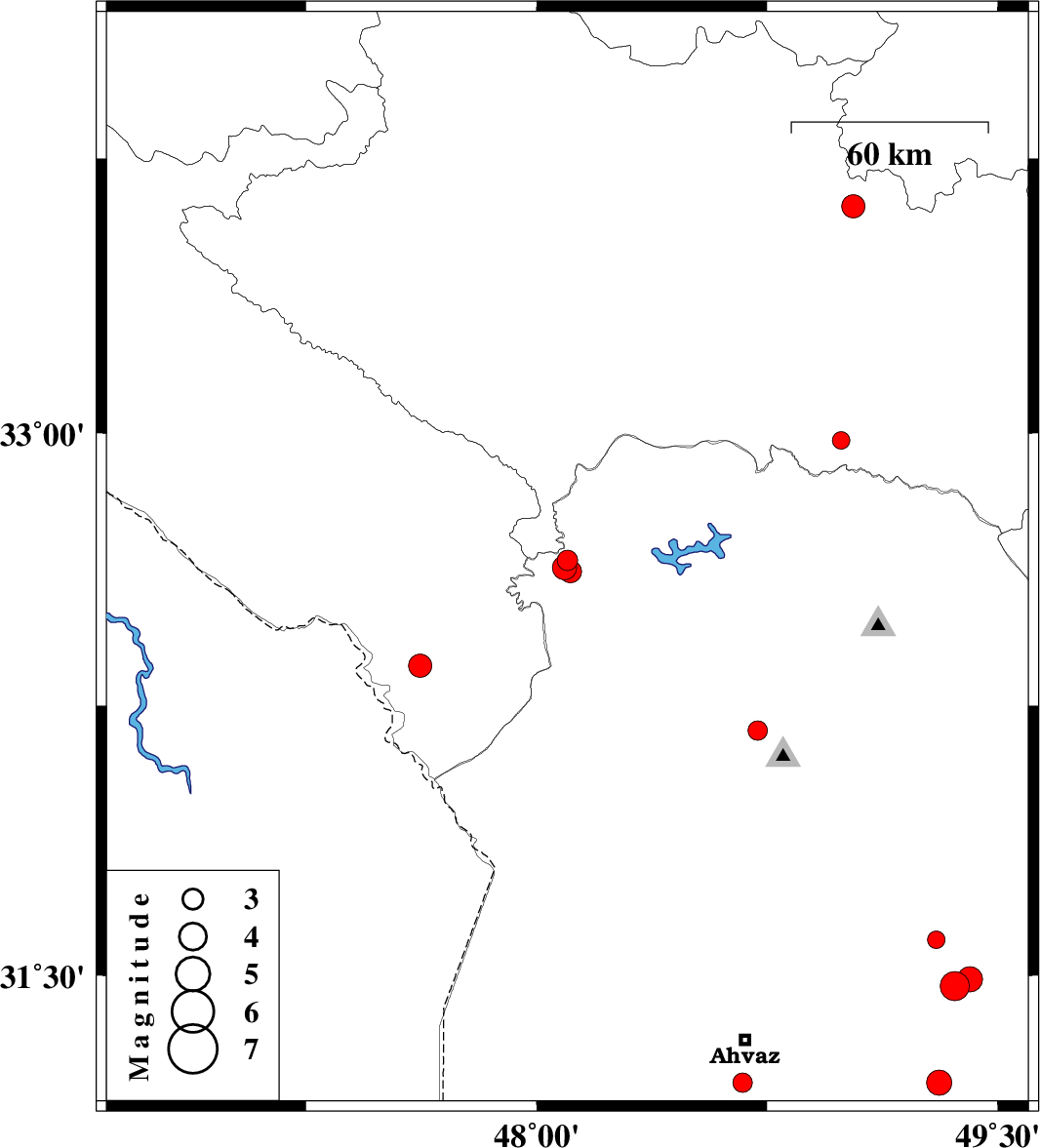 | 2007/12/25 | 23:26:09.9 | 02:56:09.9 | 31.6 | 49.3 | 38 | ML2.6 | 37 km South of Masjed Soleyman, Khoozestan Province | ||