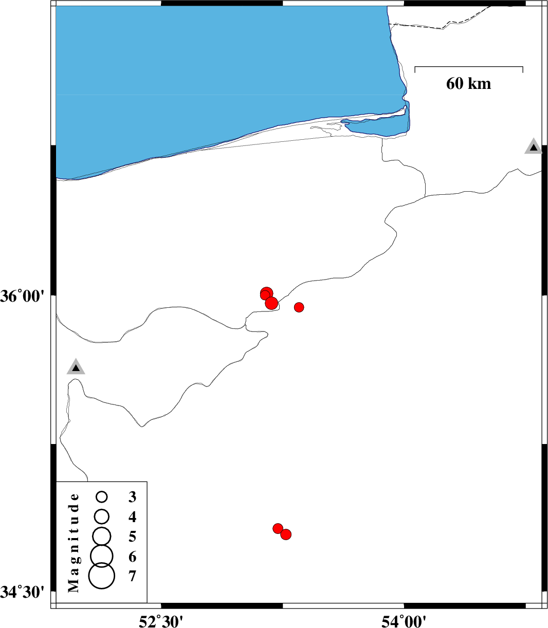 2008/01/14 07:52:34.9 11:22:34.9 3653.1416 ML2.7 15 km South of Pol-E-Sefid, Mazandaran Province