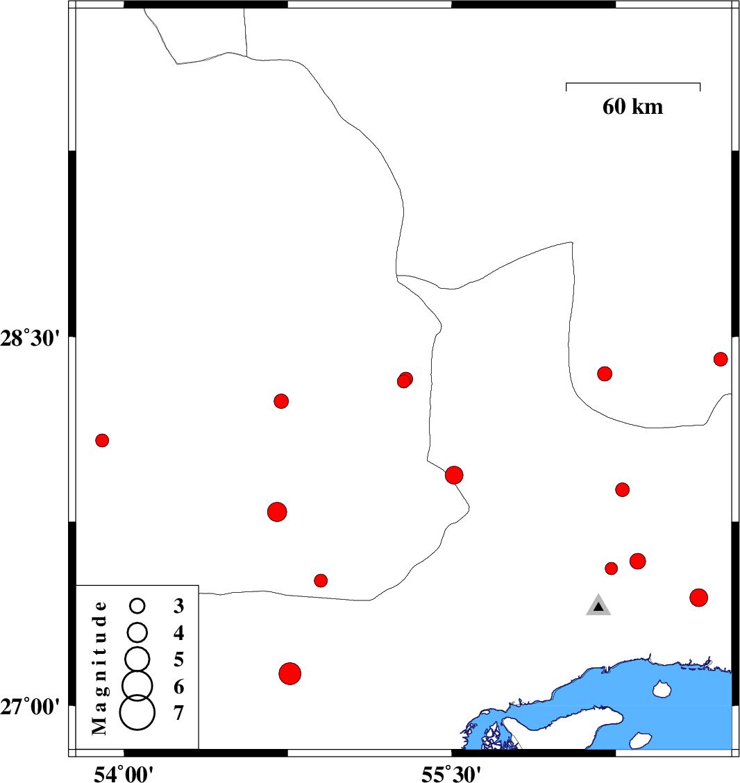 2008/01/04 | 00:52:18.3 | 04:22:18.3 | 27.88 | 56.28 | 14 | ML2.8 | 60 km South-East of Hajiabad, Hormozgan Province | ||