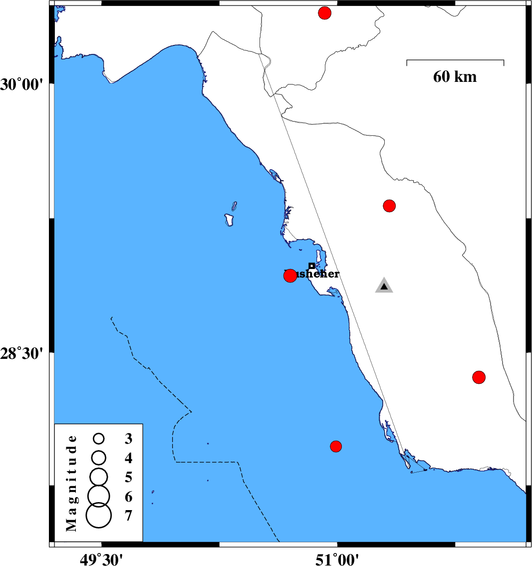 2008/01/23 | 11:21:25.9 | 14:51:25.9 | 28.93 | 50.7 | 45 | ML3.8 | Persian Gulf, 14 km West of Busheher | ||