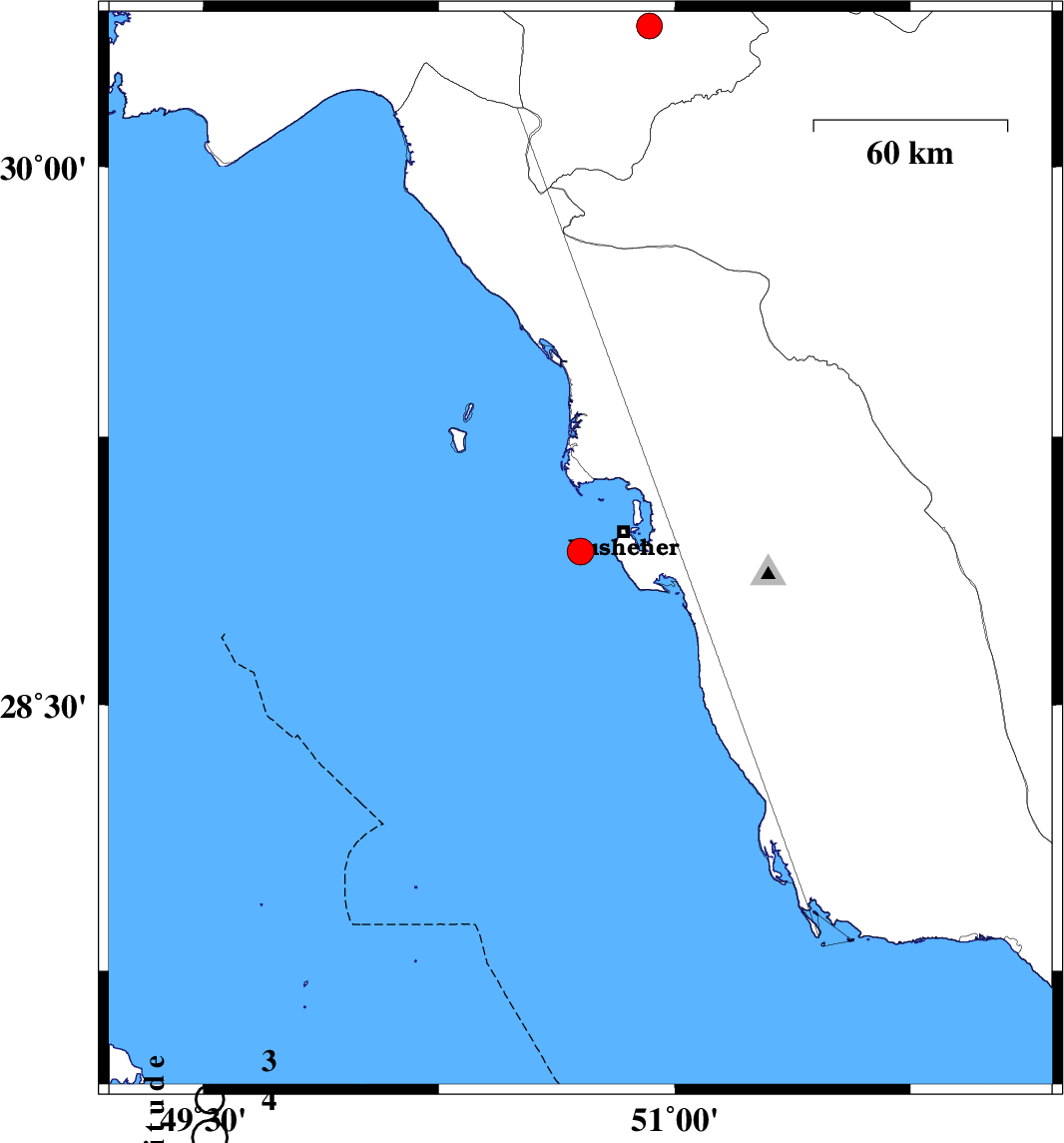 2008/01/23 | 11:21:25.9 | 14:51:25.9 | 28.93 | 50.7 | 45 | ML3.8 | Persian Gulf, 14 km West of Busheher | ||